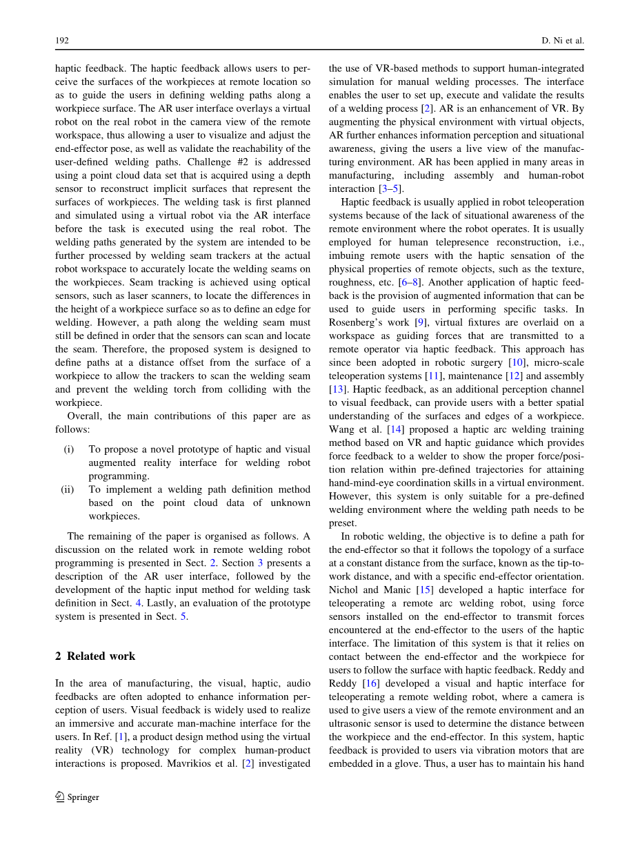在机器人焊接作业中,目标是定义一条路径,作为末端执行器的移动方向,该路径是距离表面恒定距离的表面拓扑(称为尖端到工件距离)。Nichol和Manic [15]开发了一个触觉界面用于远程弧焊机器人的远程操作,使用安装在末端执行器上的力传感器将末端执行器遇到的力传递给末端执行器和工件之间进行触觉接触的用户,用户通过触觉反馈跟随表面。Reddy和Reddy [16]开发了一种视觉和触觉界面,用于遥控远程焊接机器人,其中一台摄像机用于向用户提供远程环境的视图,并使用一个超声波传感器来确定工件与终端设备之间的距离。在这个系统中,触觉反馈通过嵌入手套的振动电机提供给用户。因此,用户必须稳定地将他的手保持在距焊接表面固定的偏移处。对于高度弯曲的曲面,这种方法不会产生平滑的路径。对于远程机焊接机器人的运动和末端执行器方向进行编程以执行精确的任务(如焊接)是一个难题。准确表示工件的几何形状非常重要,因为用户无法通过物理的形式接触它。因此,与本节介绍的作品相比,本研究提出了一种将触觉感知通道与AR结合的系统。使用AR而不是VR,用户可以获得更好的远程环境情境感知能力,而添加触觉通道则可以使用户更好地理解工件,从而更准确地定义焊接路径。此外,这项研究通过利用从远程环境的深度相机获得的3D点云数据来解决动态的远程环境,以便在工件没有预先知道的情况下沿工件表面产生触觉引导。