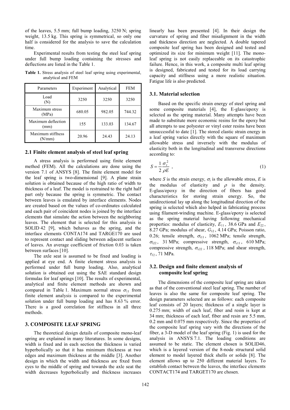 本文介绍了钢板弹簧和玻璃纤维增强聚合物复合材料多片弹簧的静态和疲劳分析,并用寿命数据分析。我们对一个轻型商用车辆的现有传统的钢板簧尺寸采样并设计计算验证。同时使用ANSYS 7.1系统对其2-d模型静态分析,并与实验结果进行比较。 该常规板簧的相同尺寸可用于制造使用E-玻璃/环氧单向层压板的复合多板簧。通过解析和实验比较了钢板弹簧的承载能力,刚度和重量。主要的设计约束是应力变形及偏转。 采用ANSYS7.1系统对复合材料多片弹簧三维模型进行有限元分析,并与实验结果进行了对比分析。 从而预测钢板弹簧和复合叶片的疲劳寿命。与钢材料弹簧相比,复合板簧比现有钢材料弹簧的应力小67.35%,刚度高64.95%,自振频率高126.98%。 使用复合板簧也可以减轻68.15%的自身重量。我们从而得出结论:复合材料的疲劳寿命比常规钢材料弹簧的寿命长。