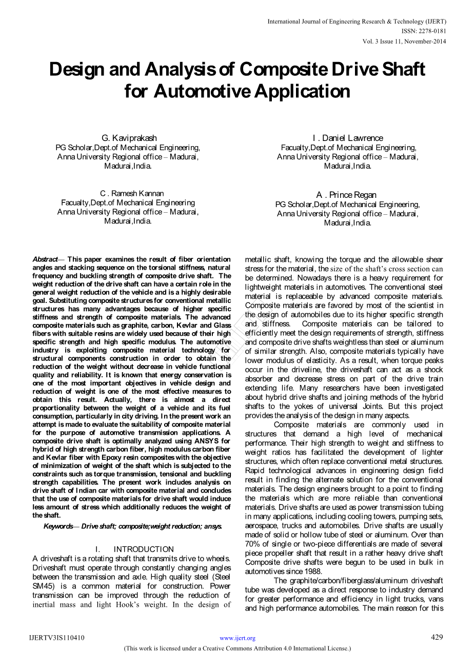 N、 Rastogi对汽车用复合材料驱动轴的设计进行了研究,他得出结论,在各种层压结构中,[plusmn;45]层压具有最高的剪切模量,是纯扭转应用中使用的主要层压结构类型[15]。