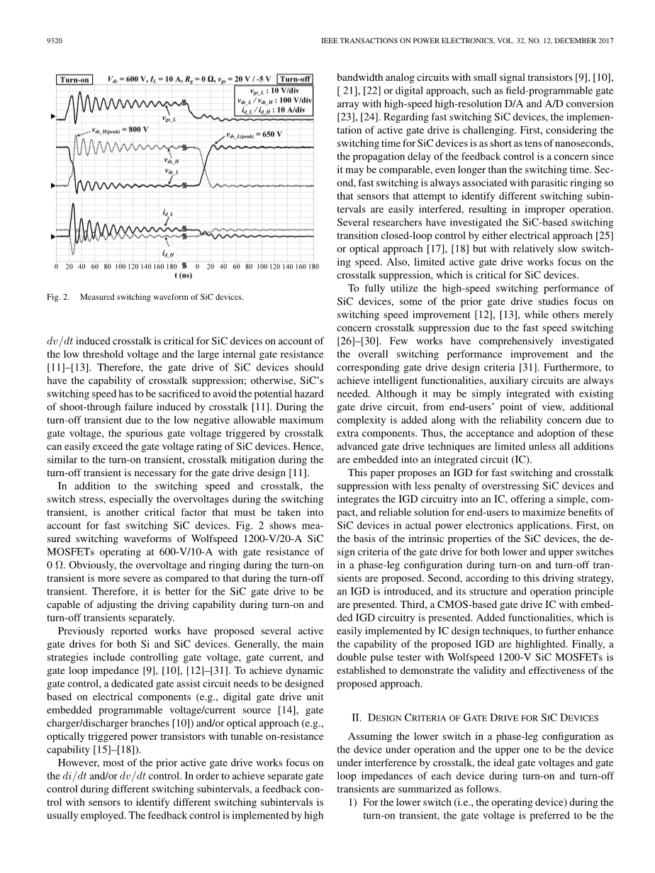 然而,大多数先前的有源栅极驱动器着重于di/dt和/或dv/dt控制。为了在不同的切换子区间期间实现单独的门控制,通常采用利用传感器来识别不同的切换子区间的反馈控制。反馈控制由带有小信号晶体管的高宽带模拟电路[9],[10],[21],[22]或数字方法,例如具有高速高分辨率D/A和A/D转换的现场可编程门阵列[23],[24]。关于快速切换碳化硅器件,实施有源栅极驱动器具有挑战性。首先,考虑到SiC器件的开关时间短至数十纳秒,反馈控制的传播延迟是一个值得关注的问题,因为它可能具有可比性,甚至比开关时间还长。其次,快速切换总是与寄生振铃有关,因此试图识别不同切换子区间的传感器容易受到干扰,导致不正确的操作。一些研究人员通过电子方法[25]或光学方法[17],[18]研究了基于SiC的开关转换闭环控制,但开关速度相对较慢。此外,有限的有源栅极驱动器着重于对SiC器件至关重要的串扰抑制。