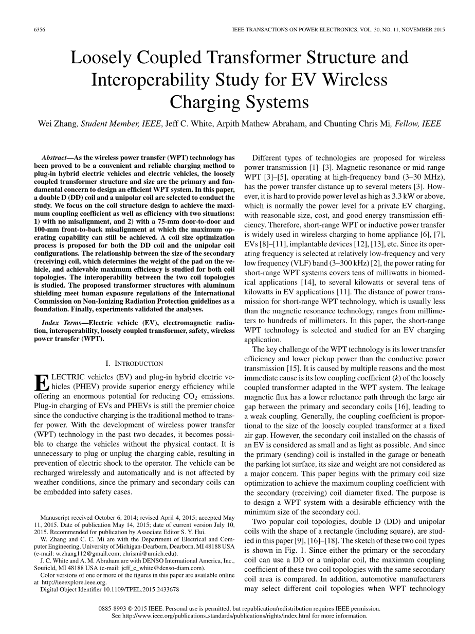关键词:电动汽车(EV),电磁辐射,互操作性,松耦合变压器,安全,无线电力传输(WPT)。