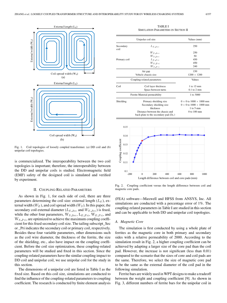 表1中列出了单极线圈的尺寸,为固定尺寸。基于这种线圈尺寸,进行仿真以发现耦合系数对耦合系数的影响。该研究由有限元分析(FEA)软件Maxwell和来自ANSYS,Inc.的HFSS进行。所有模拟都以百分比误差1%进行。表I中耦合相关参数在本节中进行了研究,可适用于DD和单极线圈拓扑。