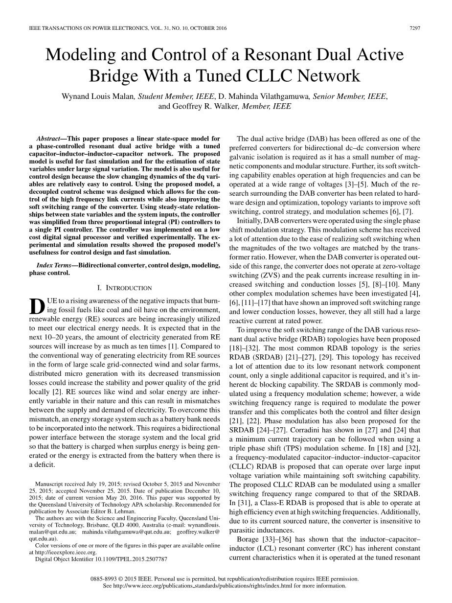 Wynand Louis Malan,学生会员,IEEE,D. Mahinda Vilathgamuwa,IEEE高级会员,和IEEE会员Geoffrey R. Walker