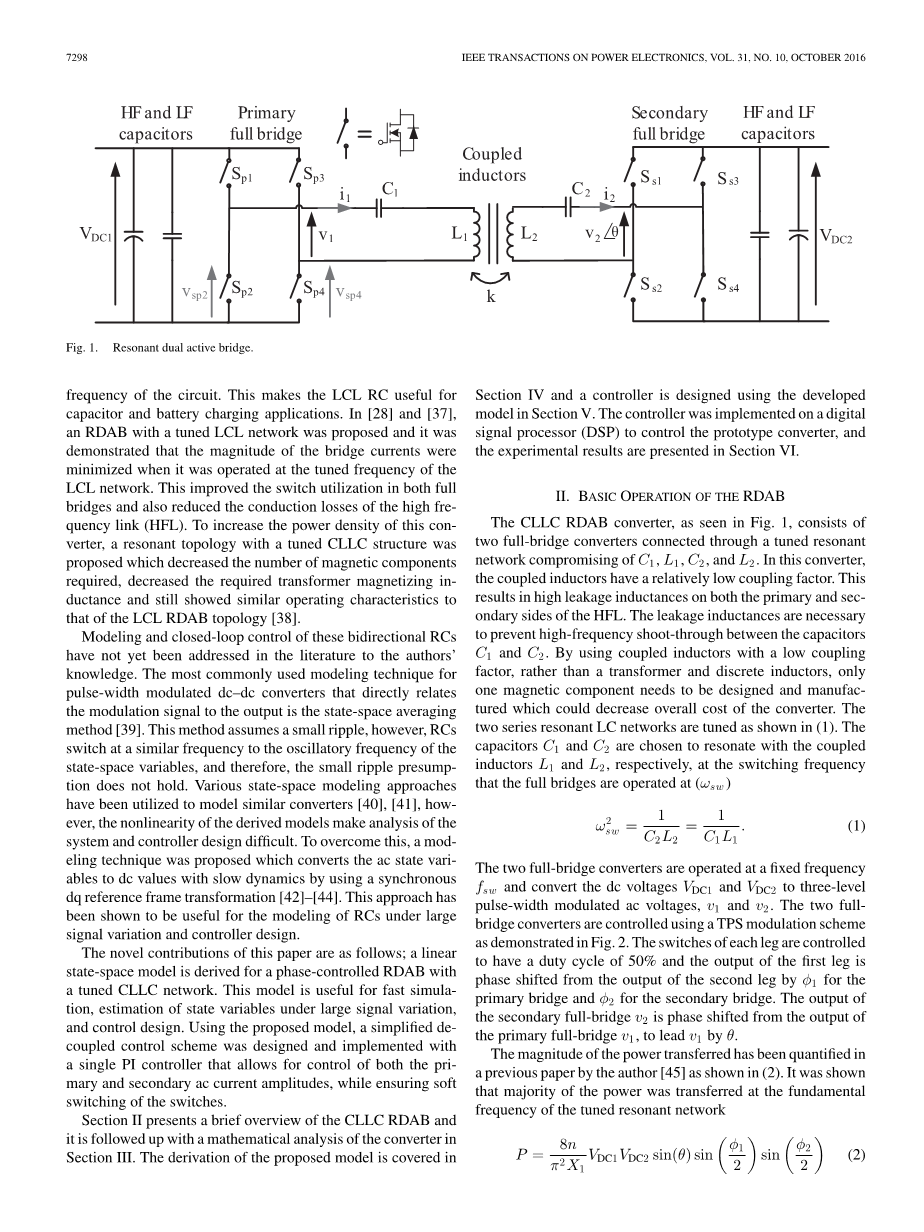电路的频率。这使LCL RC有用电容器和电池充电应用。在[28]和[37]中,提出了一个具有调谐LCL网络的RDAB,它是证明了电桥电流的大小当它以调谐频率运行时最小化拼箱网络。这提高了交换机的全部使用率并且还降低了高频的传导损耗链接(HFL)。为了增加该转换器的功率密度,具有调谐CLLC结构的谐振拓扑是建议减少磁性元件的数量所需的,减少了所需的变压器磁化电感并仍然表现出类似的经营特点LCL RDAB拓扑结构[38]。这些双向RC的建模和闭环控制在文献中还没有提到作者的观点,知识。最常用的建模技术与直接相关的脉宽调制DC-DC转换器输出的调制信号是状态空间平均值方法[39]。然而,这种方法假设一个小的波动,RCs以类似于频率的振荡频率切换状态空间变量,因此,小波纹假设不成立。各种状态空间建模方法已被用来模拟类似的转换器[40],[41],但是,导出模型的非线性进行分析系统和控制器设计困难。为了克服这个,建模技术被提出来转换交流状态变量通过使用同步,以慢速动态转换为直流值dq参考系变换[42] - [44]。这种方法有已被证明可用于大规模RC的建模信号变化和控制器设计。