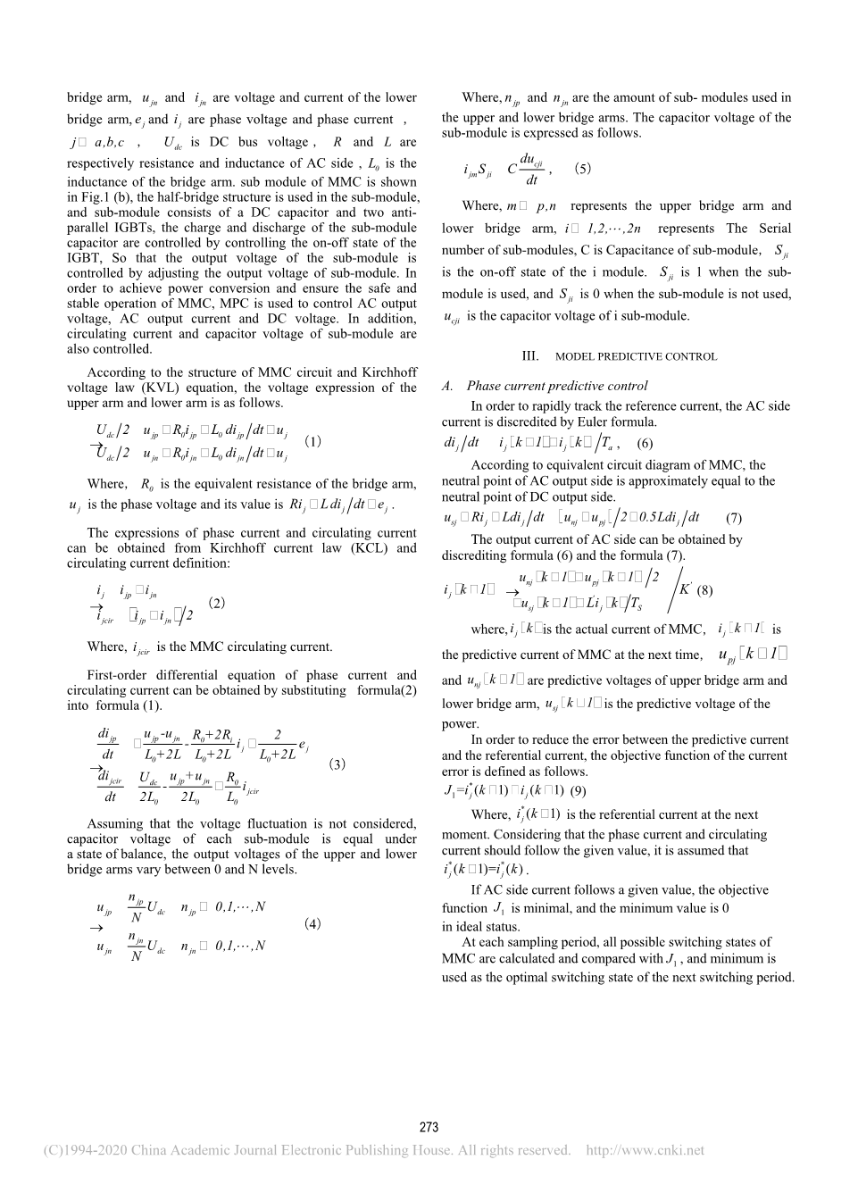 i jcir是MMC循环电流。将公式(2)代入公式(1),即可得到相电流和循环电流的一阶微分方程。