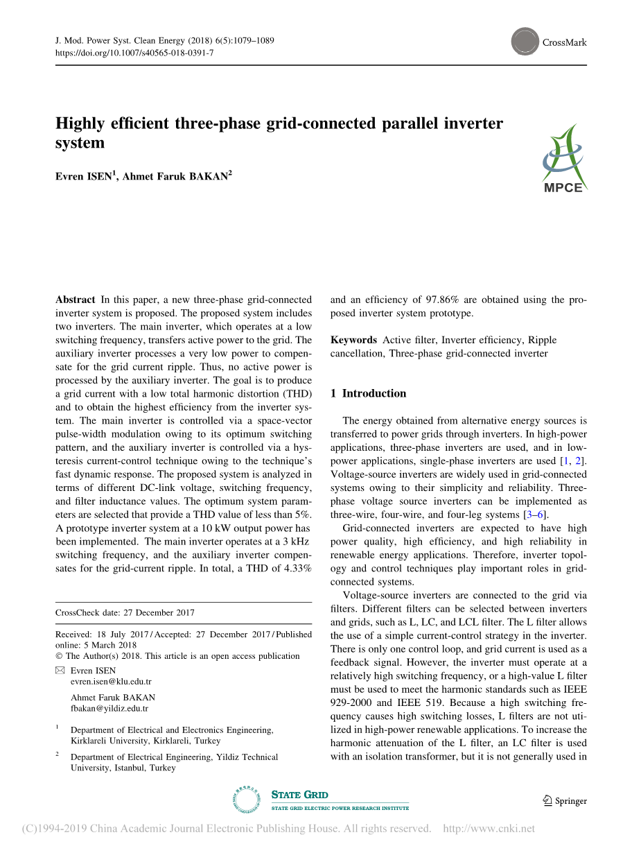 在本文中所提及的,是一种新的三相并网逆变器系统。该系统包括两个逆变器。主逆变器以较低的开关频率工作,向电网传输有功功率。辅助逆变器处理非常低的功率,以平衡电网电流谐波。总之,辅助逆变器不产生有功功率。目标是产生一个低总谐波失真(THD)的电网电流,并从逆变器系统中获得最高的效率。主逆变器由于其最佳的开关模式而通过空间矢量脉宽调制来控制,而辅助逆变器由于该技术的快速动态响应而通过滞回电流控制技术来控制。根据不同的直流环节电压、开关频率和滤波电感值对所提出的系统进行了分析.. 最佳系统参数选择提供小于5%的THD值。实现了一个10千瓦输出功率的原型逆变器系统。主逆变器以3kHz的开关频率工作,辅助逆变器满足电网电流谐波的要求。利用提出的逆变器系统原型,获得了4.33%的THD和97.86%的效率。