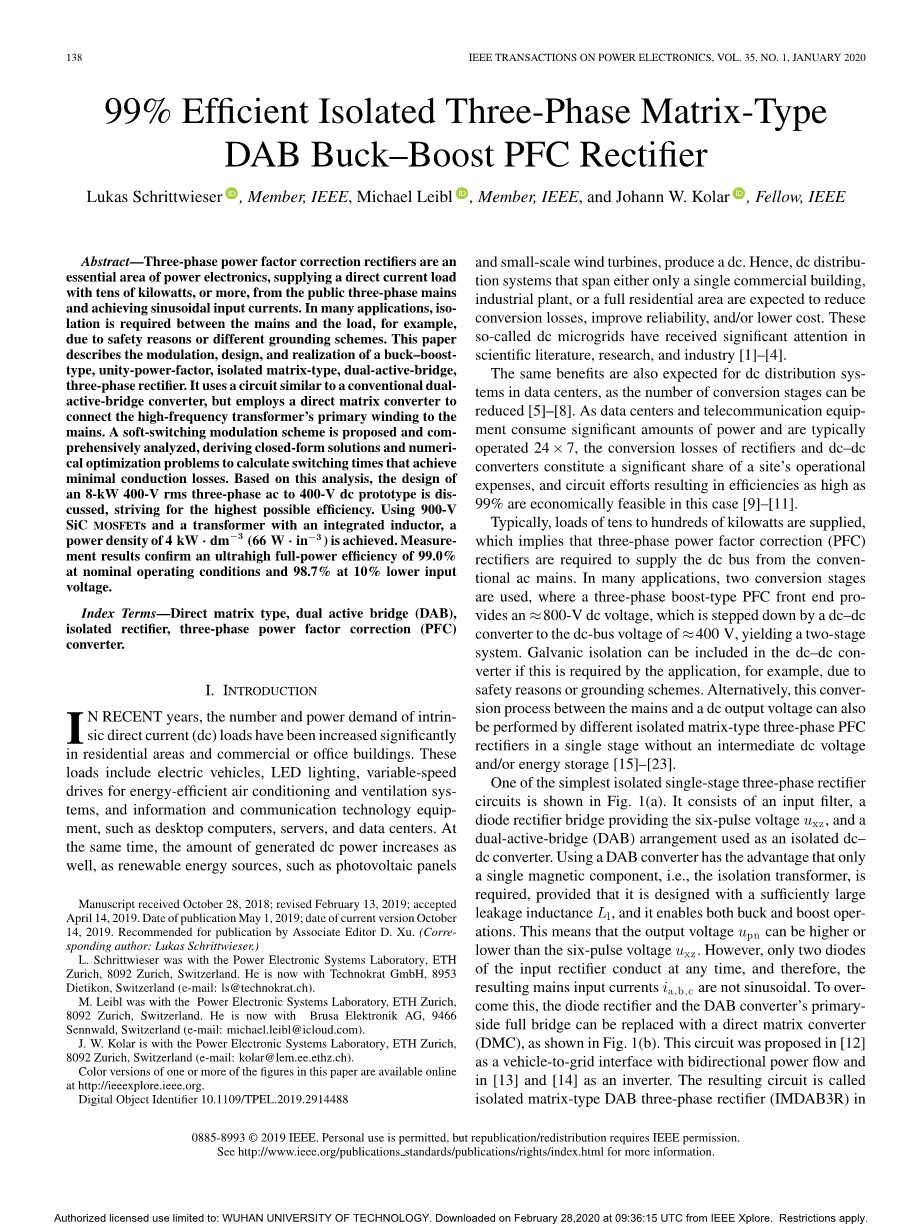 摘要:三相功率因数校正整流器是电力电子学的重要领域,它从公用三相电源向直流负载提供数十千瓦或更高的功率,并实现正弦输入电流。在许多应用中,例如由于安全原因或不同的接地方案,在电源和负载之间需要隔离。本文介绍了降压-升压型,单位功率因数,隔离矩阵型,双有源桥,三相整流器的调制,设计和实现。它使用类似于常规双有源桥转换器的电路,但采用直接矩阵转换器将高频变压器的初级绕组连接到电源。提出并全面分析了软开关调制方案,得出闭式解和数值优化问题,以计算实现最小传导损耗的开关时间。基于此分析,讨论了一个8kW 400V rms三相交流到400V 直流原型的设计,力求实现最高的效率。使用900V SiC MOSFETs和带有集成电感器的变压器实现了的功率密度。测量结果证实,在额定工作条件下的超高全功率效率为99.0%,在输入电压降低10%时为98.7%。