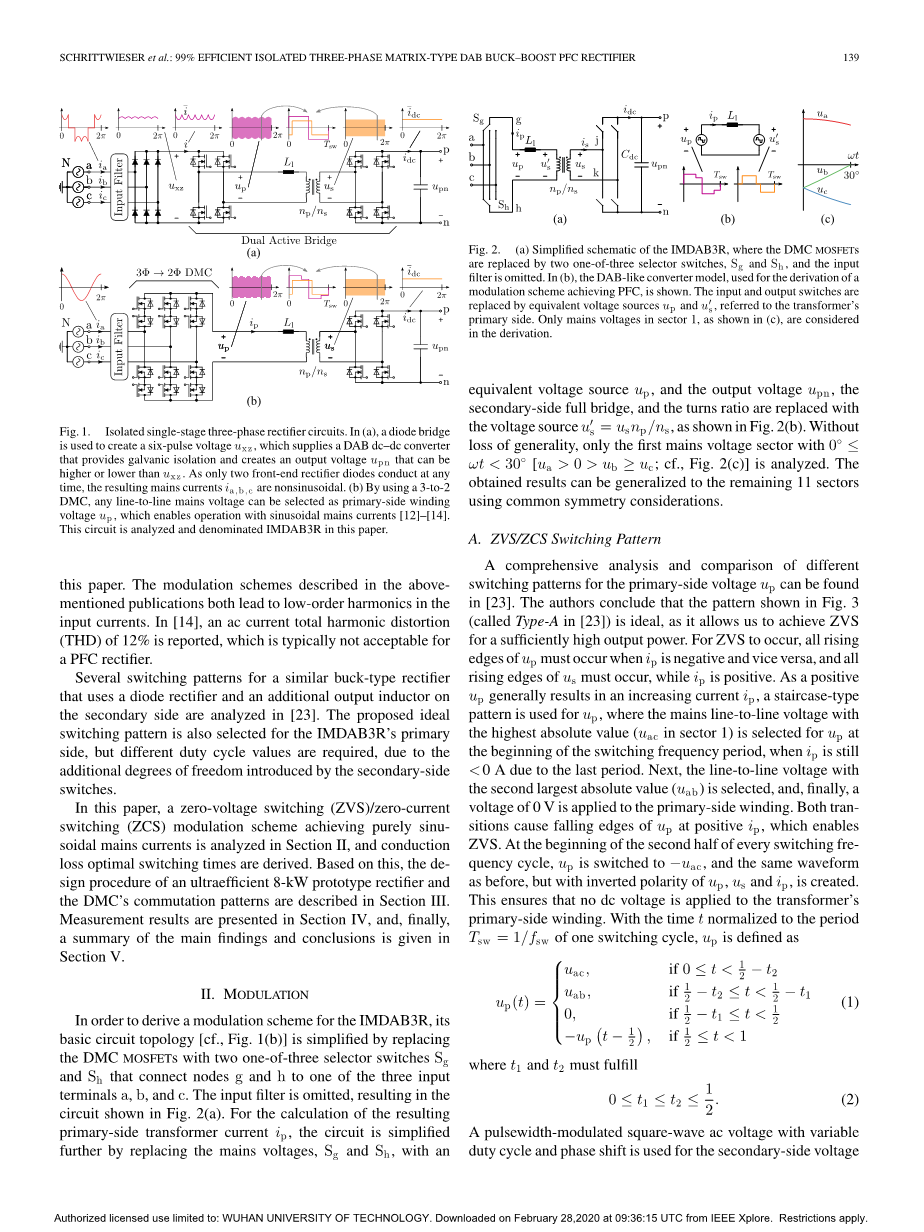 本文在第二部分分析了实现纯正弦电源电流的零电压开关(ZVS)/零电流开关(ZCS)调制方案,并推导了传导损耗的最佳开关时间。基于此,第三部分描述了超高效8kW原型整流器的设计程序和DMC的换向模式。第四节介绍了测量结果,最后,第五节给出了主要发现和结论的摘要。