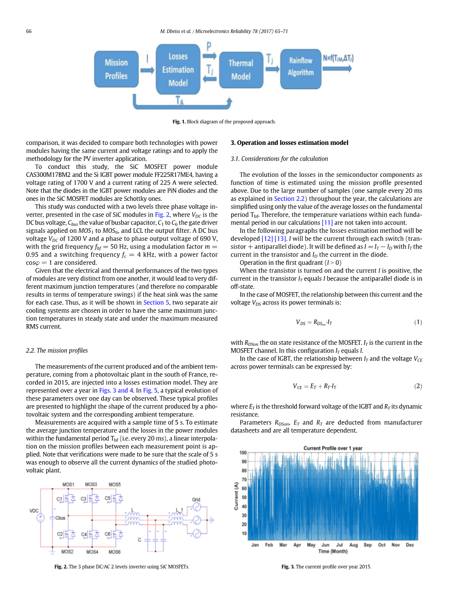 本文比较研究了在光电逆变器应用中,SiC MOSFET和Si IGBT他们的结的相关变化。通过将从光伏发电厂提取的一年多的当前任务剖面引入计算工具,对这些变化进行估计。后者基于损耗模型和热模型,包括两者之间的耦合。详细计算了第三象限SiC MOSFET的损耗。得到结果是半导体结的温度曲线,它允许确定和比较SiC MOSFET和Si IGBT功率模块中的热约束。
