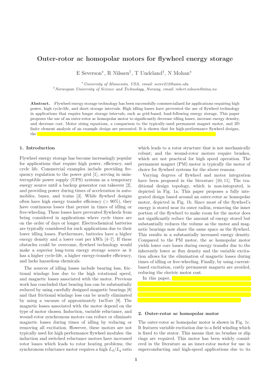 摘要 飞轮储能技术已经成功的商业化,适合要求高能量,高循环寿命以及短时间储存的应用领域。飞轮技术的高空载损耗,使得其无法在要求更长的存储间隔,例如基于网格,负载跟踪能量存储的应用中得到好的发展。本文提出了利用外转子交流单极电机可以很好的减小空载损耗,增加能量密度以及减小成本。将电机的尺寸方程与典型的永磁电机进行比较,并且给出一个实例进行三维有限元分析。给出的结果表明,对于高性能飞轮的设计,交流单极电机具有和永磁电机相当的转矩密度。