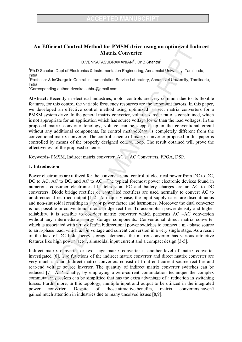 本文的研究已经对间接的应用产生了现有的结果矩阵转换器。 在本文中,提出了一个优化间接的系统用于PMSM系统驱动的矩阵转换器。 所提出的矩阵变换器的控制设计