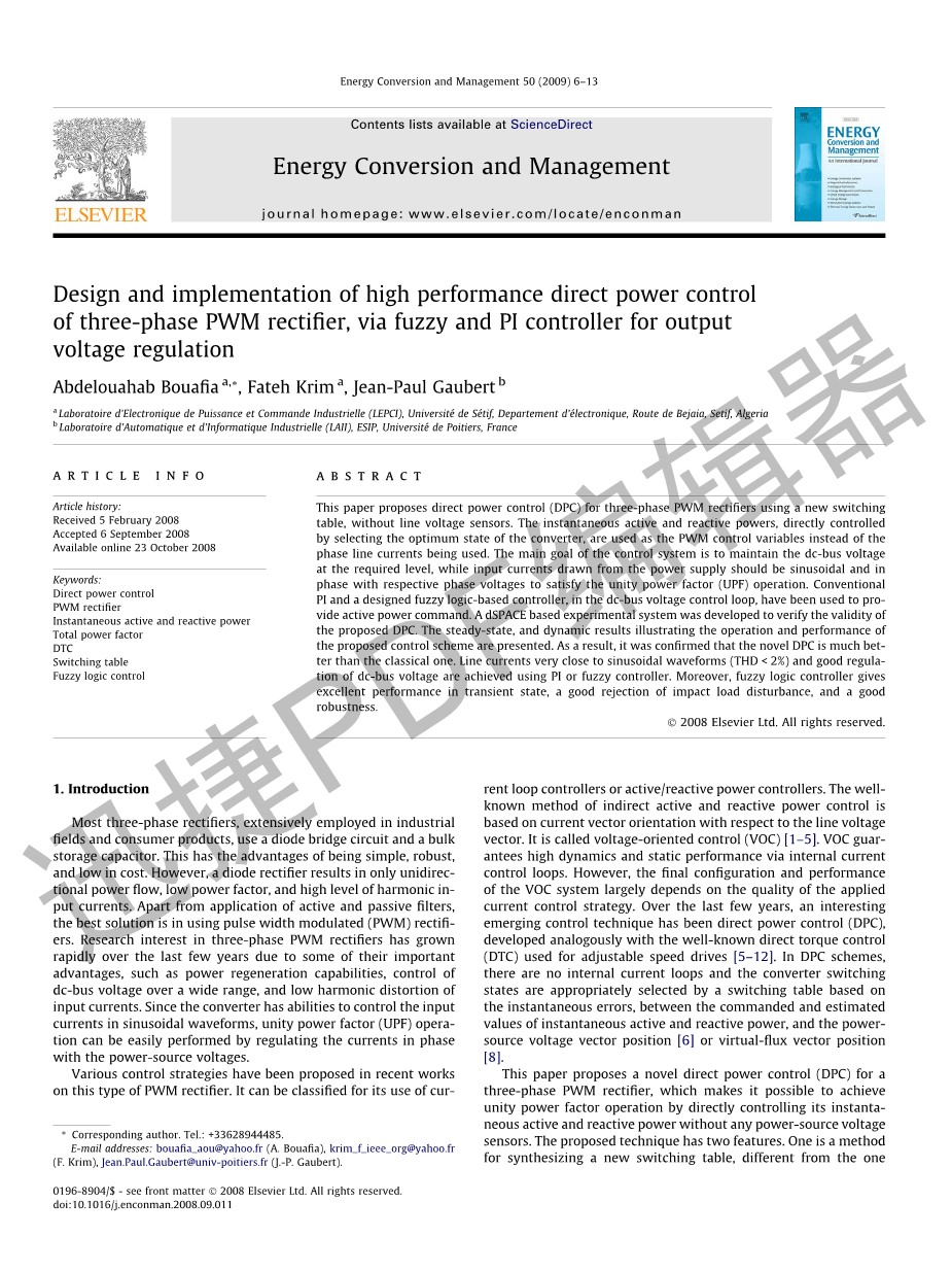 由于转换器有能力来控制输入的正弦波电流,功率因数(UPF)可以容易地操作通过调节伴有前述电源电压。各种控制策略已经提出了在最近的这种类型的PWM整流器产品。它可以被分类为所用的回路控制器或有功/无功功率控制器。在知名间接的有功和无功功率控制方法中,是基于相对于电流矢量方向所述的线电压向量。它被称为电压定向控制(VOC)。VOC保证了高动态,并通过内部电流静态性能控制回路。然而,最终的配置和性能的VOC的系统在很大程度上取决于所施加当前的控制策略的质量。在过去的几年中,一个高利润的新兴控制技术一直是直接功率控制(DPC)和与众所周知直接转矩控制开发相似(DTC),用于可调速驱动器。在DPC方案,没有内部电流环路和转换器的开关状态,是通过一个交换表基于瞬时错误作出适当地选择,在命令和估计瞬时有功和无功功率值的估计值,和功率源电压矢量位置或虚拟磁通矢量位置之间。本文提出了一种新的直接功率控制(DPC)的三相PWM整流器,这使得有可能实现通过直接控制它的瞬时功率因数运行无需任何电源电压有功和无功传感器。这个新的转换表是通过分析瞬时有功功率和无功功率校正合成的。其他一个是模糊逻辑控制器,在直流母线电压控制回路,开发提供有功功率命令。为了实现单位功率因数运行,无功功率指令设定为零。基于模糊逻辑控制器有更多的灵活性和更好的动态响应。最后,DPC进行了模拟,并实施常规PI控制器和模糊控制器。它是通过仿真和实验结果表明,该提出的DPC具有高性能相比于经典。线电流非常接近正弦波形,是直流母线电压精确调节得意实现,和UPF操作得以实现。此外,基于模糊逻辑控制器有优良的瞬态性和稳态性,有良好鲁棒性,直流总线电压调节有良好的动态特性和良好的甩负荷扰动的影响。