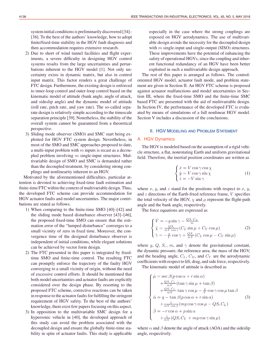 1)从安全的角度来看,非常希望能够及时完成故障诊断和相应的适应[15]、[16]。文献[27]和[28]中的重要早期工作讨论了标称系统的有限时间稳定性。因此,文献中有一些结果考虑了具有快速收敛速度和高精度控制性能的有限时间控制技术[29]–[33]。此外,固定时间稳定性的概念不依赖于初步发现的系统初始条件[34]-[38]。据作者所知,需要对如何在HGV中采用有限时间/固定时间稳定性进行故障诊断和调节进行广泛的研究。