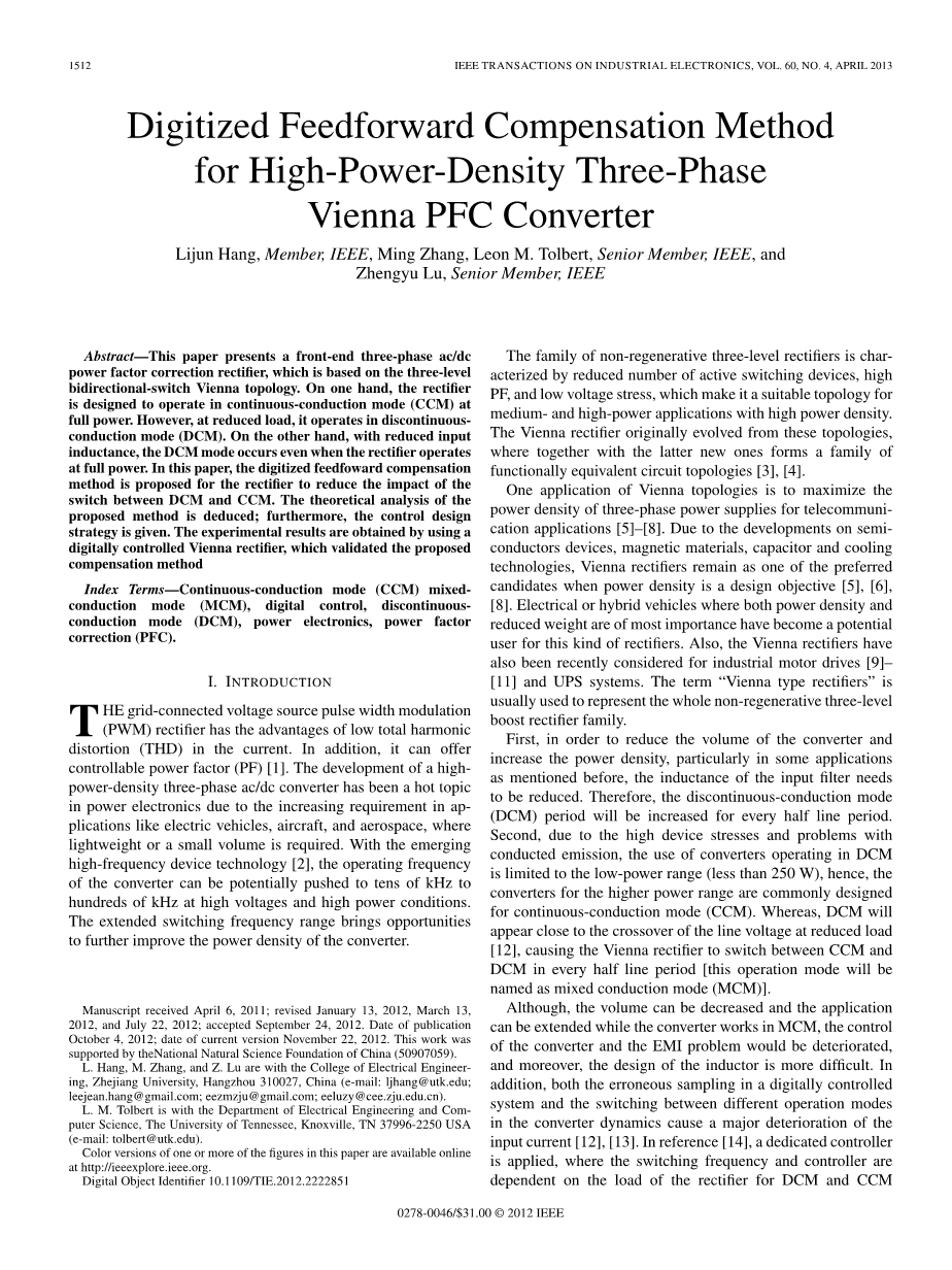 Lijun Hang,IEEE会员;Ming Zhang;Leon M. Tolbert,IEEE高级会员;Zhengyu Lu,IEEE高级会员
