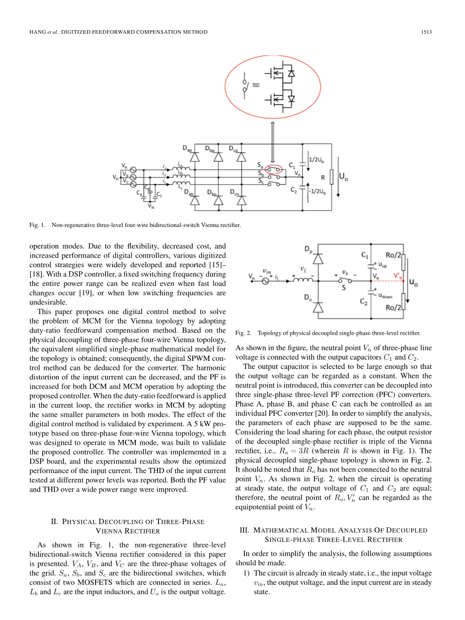 摘要 - 本文提出了一种基于三相双向开关维也纳拓扑结构的前端三相交/直流功率因数校正整流器。 一方面,整流器设计为在全功率下以连续导通模式(CCM)工作。 但是,在负载减小的情况下,它以非连续导通模式(DCM)工作。 另一方面,随着输入电感降低,即使整流器以全功率工作,DCM模式也会发生。 本文针对整流器提出了数字化前馈补偿方法,以减小DCM与CCM之间切换的影响。 推导了该方法的理论分析; 并给出了控制设计策略。 实验结果通过使用数字控制的维也纳整流器获得,验证了所提出的补偿方法