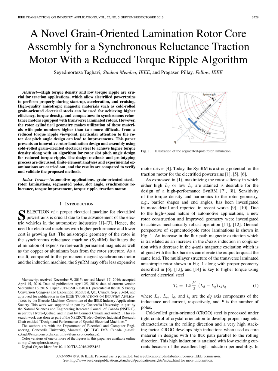 关键词:汽车应用,晶粒取向钢,转子叠片,分段磁极,槽角,同步磁阻,转矩改进,转矩脉动,牵引电机