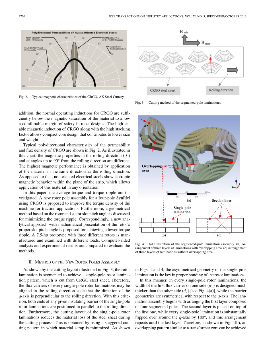 如该图所示,在轧制方向(0°)和与轧制方向成90°的角度上,磁性能是不同的。通过在与轧制方向相同的方向上应用材料获得最高的磁性能。与此相反,非取向电工钢在带材平面内表现出各向同性的磁性行为,这允许以任何取向应用这种材料。本文研究了平均转矩和转矩脉动。为了提高牵引电机的转矩密度,提出了一种采用CRGO的四极同步电机转子磁极组件。此外,还讨论了一种基于转子和定子槽距角的几何方法,以减小转矩脉动。相应地,本文提出了一种新的分析方法,用数学方法表示转子的适当槽距角,以获得较低的转矩脉动。制造了一个具有三个不同转子的7.5马力的样机,并对其进行了不同负荷下的试验。通过计算机辅助分析与实验结果的比较,对该方法进行了评价。