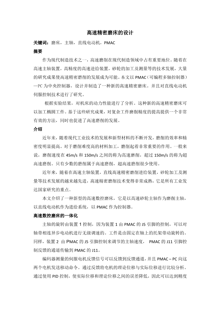 Recently, with the technological progress of modern industry and continuous exploitation of new material, the efficiency and precision of grinding have remarkably been advanced. For the machining of difficult-to-cut materials, the grinding plays a very important role. Generally speaking, grinding with the peripheral speed of grinding wheel among 45 m/s and 150 m/s is called high speed grinding, and that over 150 m/s ultra-high-speed grinding. Only a few of machining belong to high speed grinding, and the ultra-high-speed grinding is rarely used. Recently, with the increasingly advanced technology of high speed spindle unit, linear high speed precision grinding feed unit, grinding wheel production, measurement and so on, the high speed precision grinding technology becomes so mature that it is the research focus of all developed industrial county. This paper introduces a new kind of high speed NC grinder that high seed spindle be used as grinding wheel spindle, linear motor as feed system, and PMAC as controller.