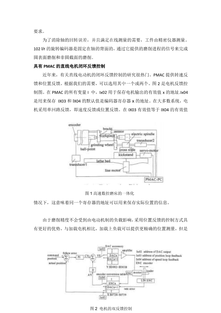 The spin of shaft is accommodated indirectly by transducer 1, since transducer 1 controlled by J5 pin of PMAC can carry out the step-less timing of asynchronous motor, which is linked with shaft by strap. The rotation of the work piece is brought along bracket fixed on shaft. Similarly, the transducer 2 controlled by J5 pin of PMAC regulates the rapidity of electrical spindle, J11 pin of PMAC controls the transmitted to feedback channel of the J11 of PMAC. The encoder's feedback signal of the servo-motor can be switched to the feedback channel, and PMAC-PC sent a movement command to the two motors. The analytical displacement of the motor is compared with the experimental displacement of the feedback elements. By using of the PID domination principle, the error between the analytical displacement and experimental displacement is reduced so that the element's accuracy is satisfied. In order to get rid of the rotary error of the shaft, and to satisfy the need of measurement on line, the work piece is supported by precision ballpoint. The 102 line/rotate rotary encoder is fixed on the back of the shaft, and its signal supplies time-base-source to process of the circle-surface grinding f the circle and non-circle section can be completed.