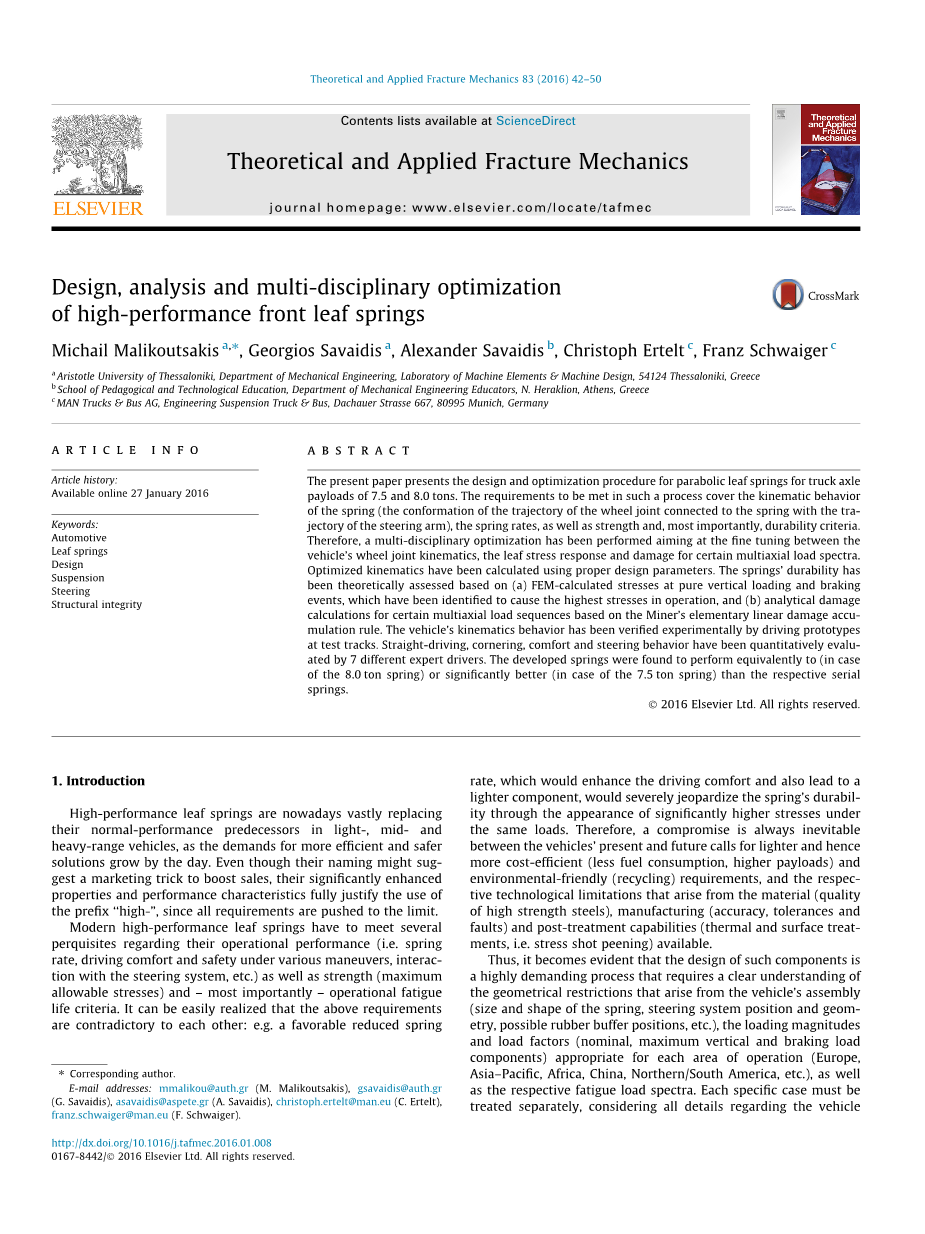 本文介绍了7.5吨和8.0吨汽车车轴载荷抛物线板簧的设计和优化过程。在这一过程中,需要满足的要求包括弹簧的运动特性(与转向臂的轨迹连接到弹簧的车轮接合处的轨迹的构造)、弹簧速度、强度以及最重要的耐久性标准。因此,针对某多轴载荷谱下车辆车轮关节运动学、叶片应力响应和损伤之间的微调问题,进行了多学科优化。利用适当的设计参数计算了优化后的运动学。根据(a)有限元计算的纯垂直载荷和制动事件下的应力,以及(b)基于矿工基本线性损伤累积的某些多轴载荷序列的分析损伤计算,对弹簧的耐久性进行了理论评估。规则。通过在试验轨道上驾驶样机,对汽车的运动学行为进行了实验验证。直行、转弯、舒适性和转向性能已由7名不同的专业驾驶员进行了定量评估。开发的弹簧性能与(8.0吨弹簧)相当,或明显优于(7.5吨弹簧)各自的系列弹簧。