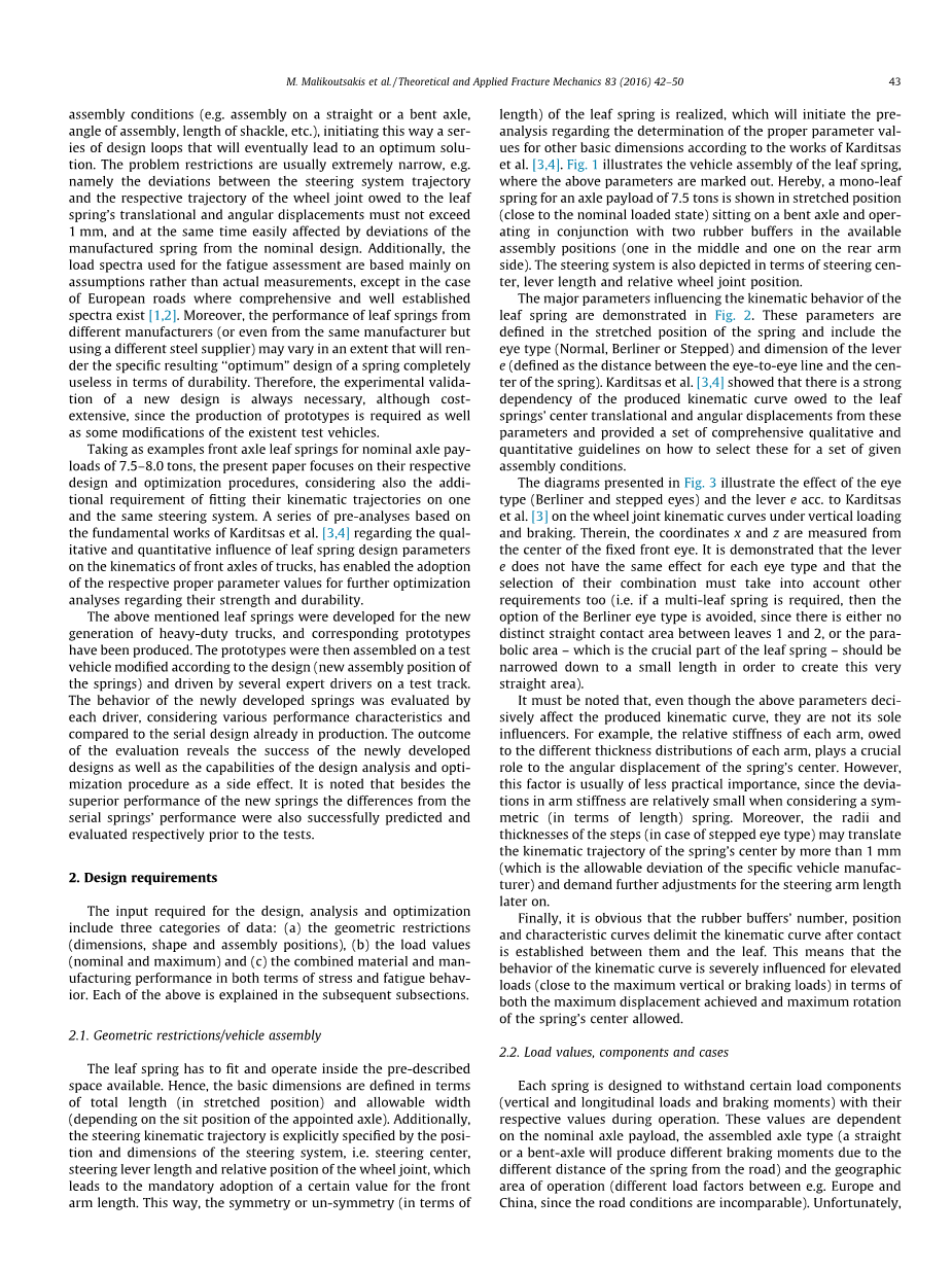 因此,很明显,这类部件的设计是一个要求很高的过程,需要清楚地了解车辆总成(弹簧的尺寸和形状、转向系统位置和几何结构、可能的橡胶缓冲位置等)产生的几何限制、荷载大小和荷载系数。适用于每个操作区域(欧洲、亚太地区、非洲、中国、北/南美洲等)以及各自的疲劳载荷谱的(额定、最大垂直和制动载荷分量)。必须单独处理每个特定情况,考虑到有关车辆装配条件的所有细节(例如,在直轴或弯曲轴上装配、装配角度、钩环长度等),以这种方式启动一系列设计回路,最终得出最佳解决方案。问题限制通常非常窄,例如,由于板簧的平移和角位移,转向系统轨迹和车轮接合处各自轨迹之间的偏差不得超过1 mm,同时容易受到制造弹簧与名义设计偏差的影响。此外,疲劳评估所用的载荷谱主要基于假设而非实际测量,但欧洲道路的情况除外,在欧洲道路上存在全面且完善的谱[1,2]。此外,不同制造商(甚至同一制造商,但使用不同的钢材供应商)的板簧性能可能会有所不同,从而导致弹簧的特定“最佳”设计在耐久性方面完全无用。因此,尽管成本很高,但新设计的试验验证始终是必要的,因为需要生产原型以及对现有试验车辆进行一些修改。