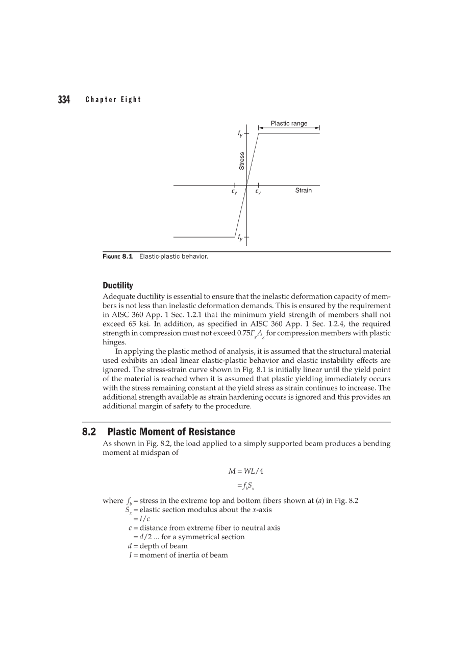 在应用塑性分析方法时,假定所用的结构材料具有理想的线弹塑性行为,且忽略了弹性失稳效应。应力-应变曲线如图8.1所示。最初是线性的,直到达到材料的屈服点,当假设塑性屈服立即发生时,应力在屈服应力下保持不变,应变继续增加。当应变硬化发生时可用的附加强度被忽略,这为过程提供了附加的安全裕度。