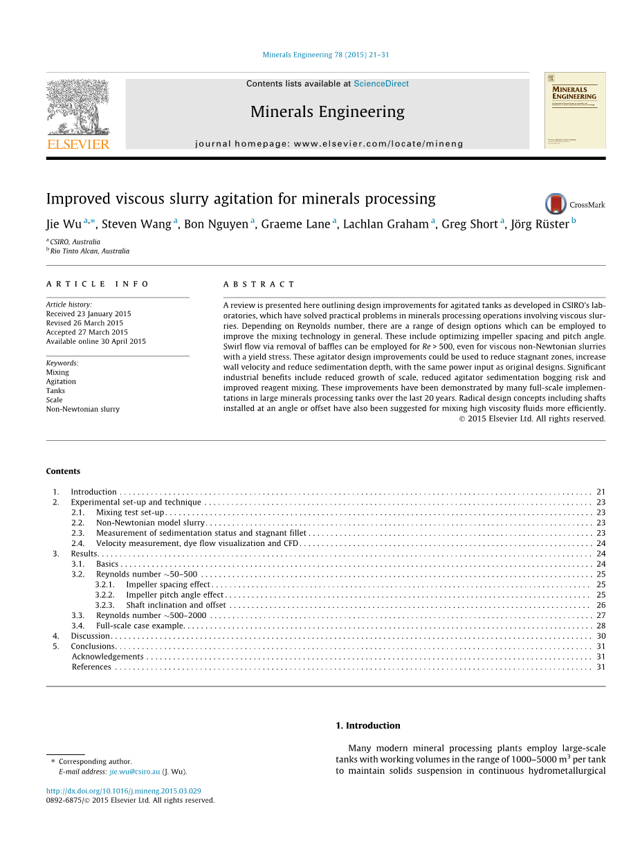 本文的目的是总结在CSIRO中混合粘性牛顿和非牛顿流体的实验室研究中开发的搅拌器设计方法,以解决矿物工业中的实际问题。 重点是在了解所涉及的流体动力学基础知识的基础上开发实际的设计改进。 在现场生产湿法冶金工艺中实施这些设计改进的大型流体罐已经为矿物工业带来了巨大的经济效益。 该评论包括CSIRO在过去20年间在许多技术期刊,会议和工业技术报告中发表的关键成果。