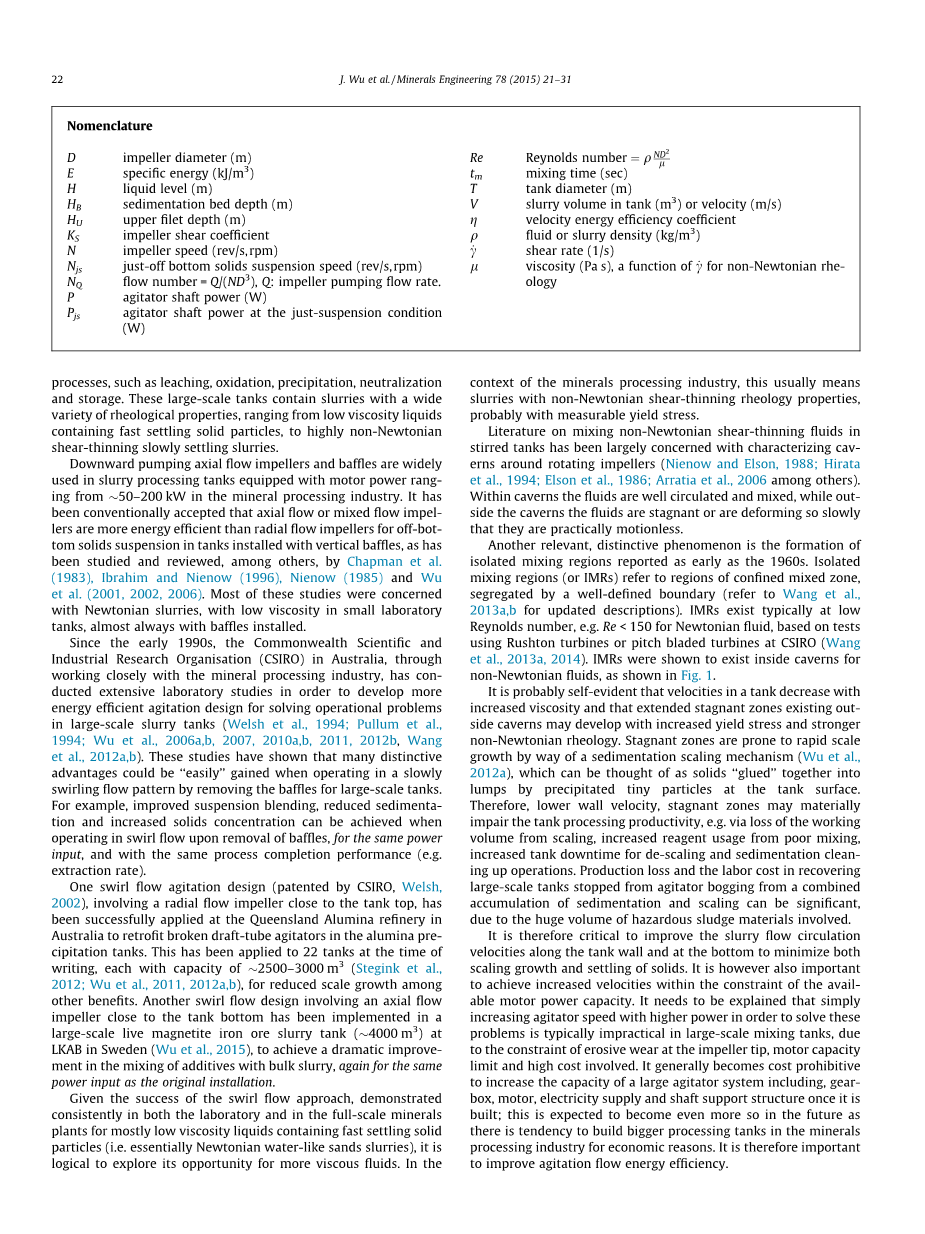 向下泵送的轴流叶轮和挡板广泛用于在矿物加工工业中装配有功率范围50-200千瓦的流体处理罐。 传统上认为轴流式或混流式叶轮比装有垂直挡板的箱体中的离心式固体悬浮液的径流式叶轮更节能。这些研究大多涉及牛顿流体,在小型实验室中低粘度,几乎总是安装挡板。