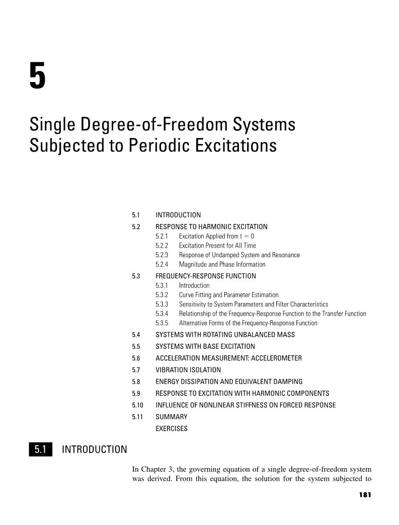 其中H是积分1的变量,其次,考虑了线性振动系统在谐波激励下的响应。首先,研究了在时间t 0激励时的响应,然后研究激励在所有时刻存在时的响应。在这一章中,我们将展示如何:分析单自由度系统对各种持续时间的谐波激励的响应。确定单自由度系统的频率响应和相位响应。解释单个自由度系统对激励频率小于、等于、大于系统固有频率的响应。从测量的频率响应确定系统参数。分析旋转不平衡和基座激励下单自由度系统的响应。使用加速度计测量单自由度系统的响应。隔离单自由度系统的振动。分析单自由度系统对多谐频率分量激励的响应。确定能量耗散和等效阻尼。