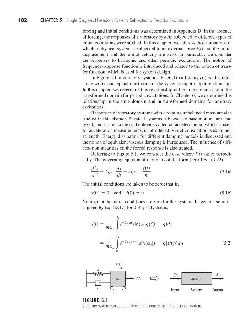 1引言 在第3章中,导出了单自由度系统的控制方程。从这个方程出发,对系统进行了求解。 在附录D中确定了强迫和初始条件,在没有强迫的情况下,研究了振动系统在不同类型初始条件下的响应。在这一章中,我们讨论了物理系统受到外力F(t)和初始位移和初始速度为零的情况。特别地,我们考虑对谐波和其他周期激励的响应。介绍了频率响应函数的概念,并将其与传递函数的概念联系起来,用于系统设计。在图5.1中,示出了受强迫F(t)的振动系统以及系统输入输出关系的概念性说明。在这一章中,我们确定了这种关系在时域和变换域中的周期性激发。在第6章中,我们确定了在任意激励下时域和变换域中的这种关系。本章还研究了具有旋转不平衡质量的振动系统的响应。对基本运动的物理系统进行了分析,在此基础上介绍了一种用于加速度测量的称为加速度计的装置。隔振时间长。讨论了不同阻尼模型的能量耗散问题,引入了等效粘性阻尼的概念。同时还研究了刚度非线性对强迫响应的影响。参考图5.1,我们考虑F(t)周期性变化的情况。运动的控制方程是形式[回忆方程(3.22)]。