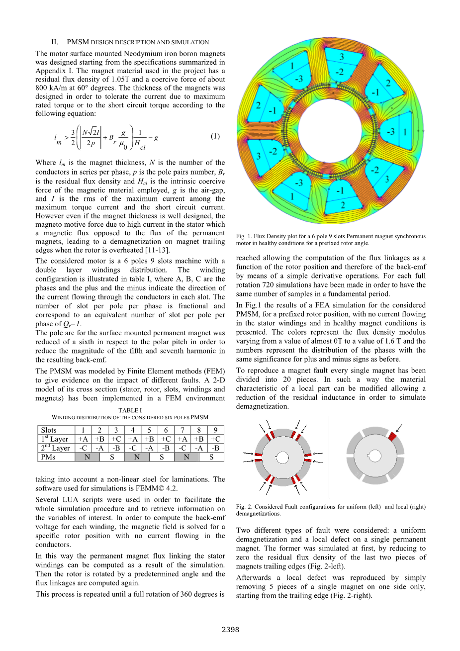 在图1中,对于所考虑的PMSM的FEA仿真的结果,对于预定的转子位置,在定子绕组和正常磁体条件中没有电流流动的情况下进行介绍。颜色表示通量密度模量从几乎0T的值变化到1.6T的值,并且数字表示与之前相同的对正号和负号具有相同显着性的相分布。