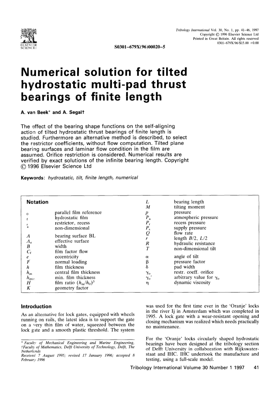 AS a alternative for lock gates,equipped with wheels running rails, the latest idea short the ate on a very thin film of water, squeezed between the lock gate and a smooth plastic threshold. The system was used for the first time ever in the lsquo;Orange locks in the river lj in Amsterdam which was completed in 1995. A lock gate with a wear-resistant opening and closing mechanism was realized which needs practically no maintenance.For the lsquo;Oranjestad locks circularly shaped hydro-static bearings have been designed at the trilogy section