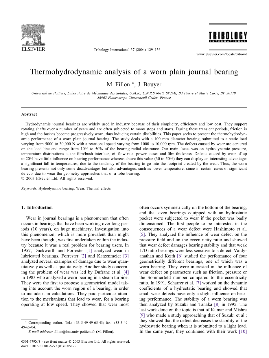 轴承中的磨损是在长时间(10年)在巨大机械上工作的轴承中经常发生的现象。 调查这种比现在更为普遍的现象首先在行业内进行,因为它是轴承用户的真正问题。 在1957年,Duckworth和Forrester [1]分析了润滑轴承的磨损情况。 Forrester [2]和Katzenmeier [3]分析了数量和质量磨损造成的损伤的几个例子。 关于磨损问题的另一项研究由Dufrane等人引导。 [4] 1983年,他分析了汽轮机的磨损轴承。 他们是第一个提出考虑到轴承磨损区域的几何模型,以便将其包括在计算中。 对于低速运转的轴承,他们特别注意导致磨损的机构。他们表明,磨损最经常在轴承的底部对称地出现,如果口袋的尺寸差,即使装有流体静力袋的轴承也磨损。第一个对磨损缺陷的后果感兴趣的人是Hashimoto等人[5]。分析了磨损缺陷对压力场和偏心率的影响,表明磨损缺陷损害了轴承的稳定性,而且L / D比较弱的轴承对缺陷的敏感性较差。Vaidyanathan和Keith [6]研究了四个几何不同轴承的性能,其中一个是a磨损的轴承。他们对摩擦、压力Sommerfeld等参数与偏心率相关的磨损缺陷的影响感兴趣比。 1991年,Scharrer等[7]研究了静压轴承的动态系数,表明小的磨损缺陷对轴承性能影响不大。然后在1995年由铃木和田中[8]分析了磨损的轴承的稳定性。关于这个话题的最后一个工作是Kumar和Mishra [9],他们接受了Suzuki等人的研究;他们表明当静载轴承承受轻负荷时,缺陷会降低静压轴承的稳定性。在同一年,他们继续工作[10],分析了处于稳态条件下的磨损缺陷的湍流中的非圆形轴承。 他们得出结论,磨损会增加摩擦和流速,并降低轴承的负载能力。