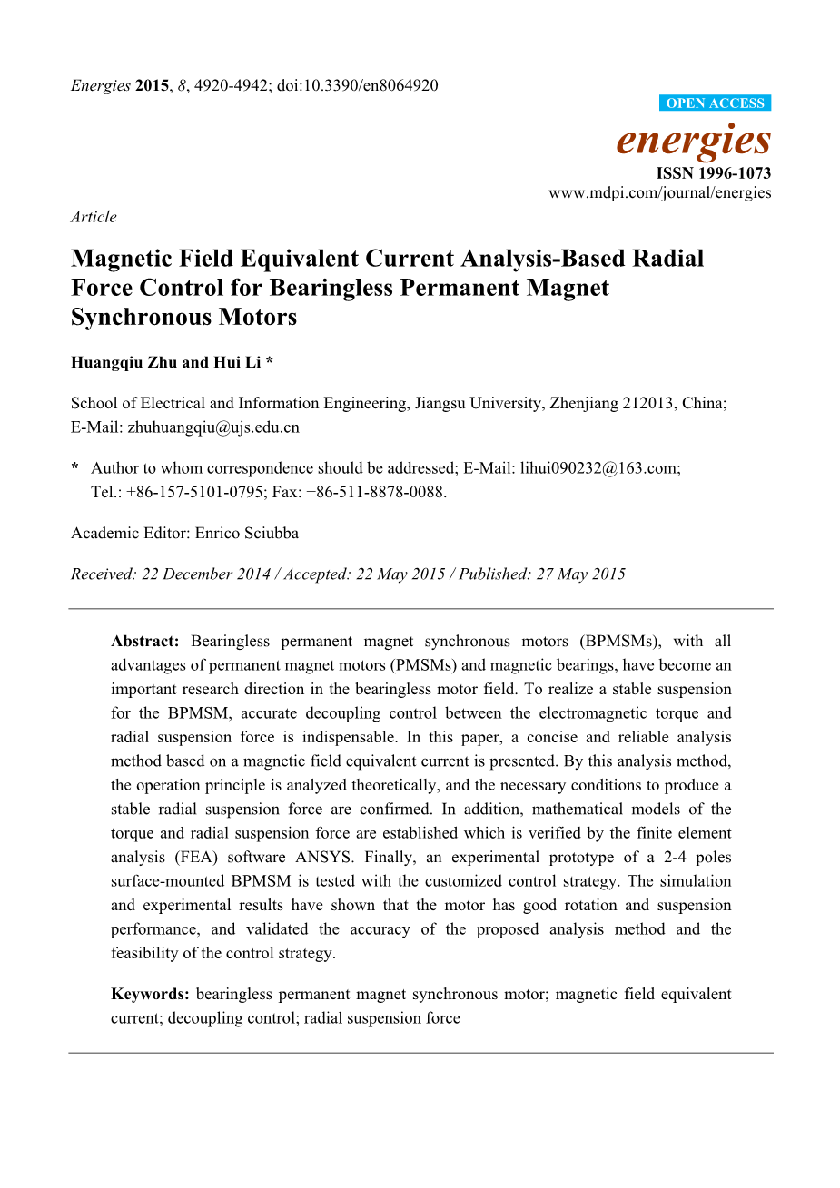 关键词:无轴永磁同步电动机;磁场等效电流;解耦控制;径向悬浮力