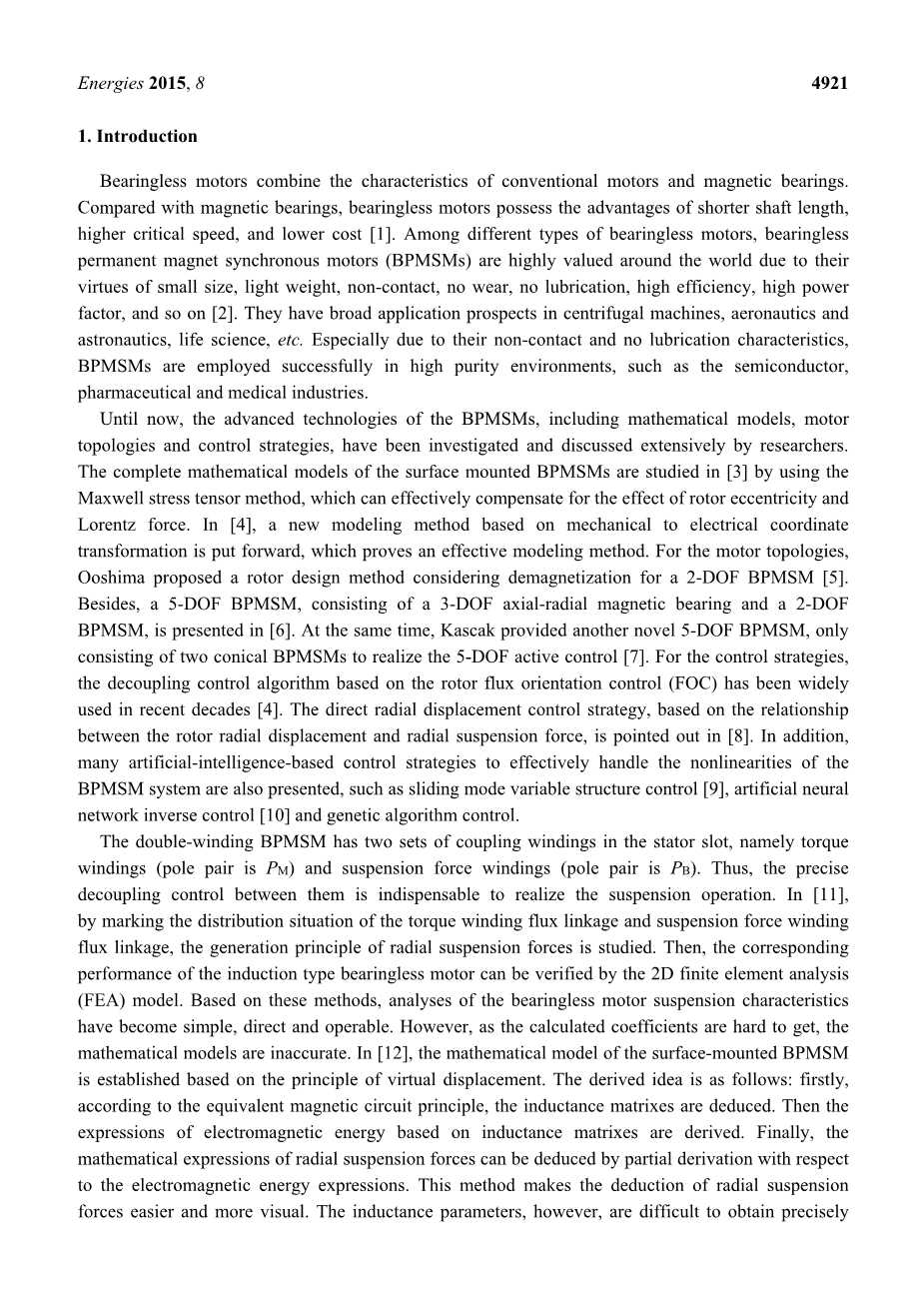 无轴电机结合了传统电机和磁力轴承的特性。与磁力轴承相比,无轴电机具有轴长更短,临界速度更快,成本更低的优点[1]。在不同类型的无轴电机中,无轴永磁同步电机(BPMSM)因其体积小,重量轻,非接触,无磨损,无润滑,高效率,高功率因数等优点而在世界范围内受到高度重视。 [2]。它们在离心机,航空航天,生命科学等领域具有广泛的应用前景。特别是由于它们的非接触和无润滑特性,BPMSM成功应用于高纯度环境,如半导体,制药和医疗行业。