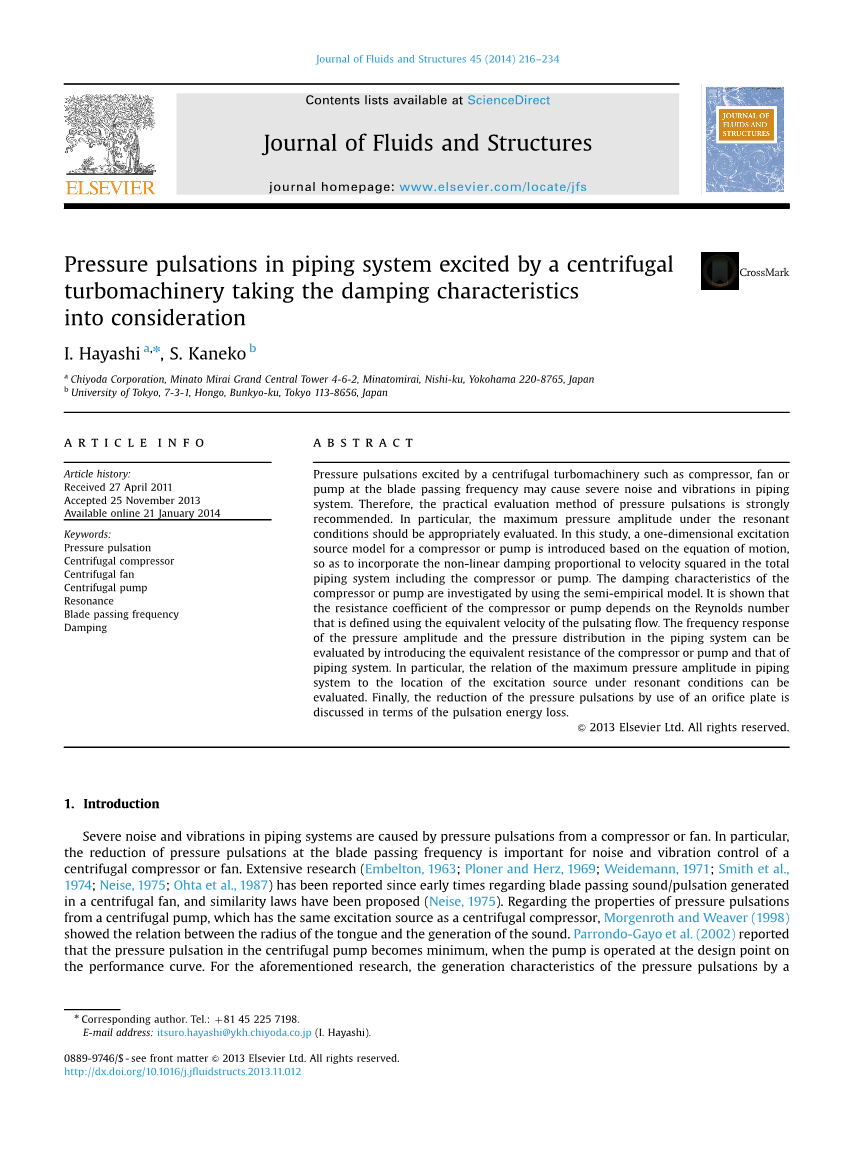 管路系统中的严重噪音和振动是由来自压缩机或风扇的压力脉动引起的。特别的是,叶片通过频率处的压力脉动的减小对于离心式压缩机或风扇的噪音和振动控制是重要的。自早期以来,已报道了广泛的研究(Embelton,1963; Ploner和Herz,1969; Weidemann,1971; Smith等,1974; Neise,1975; Ohta等,1987)离心风扇和相似性法则(Neise,1975)。关于与离心式压缩机具有相同激励源的离心泵的压力脉动特性,Morgenroth and Weaver(1998)展示了隔舌半径与声音产生之间的关系。 Parrondo-Gayo et al(2002)报道,当泵在性能曲线上的设计点运行时,离心泵中的压力脉动变得最小。对于上述研究,已经从设备的设计参数明确了压缩机或风扇本身的压力脉动的产生特性。但是,管道系统中的压力脉动幅度需要通过考虑管道中的响应特性来评估。