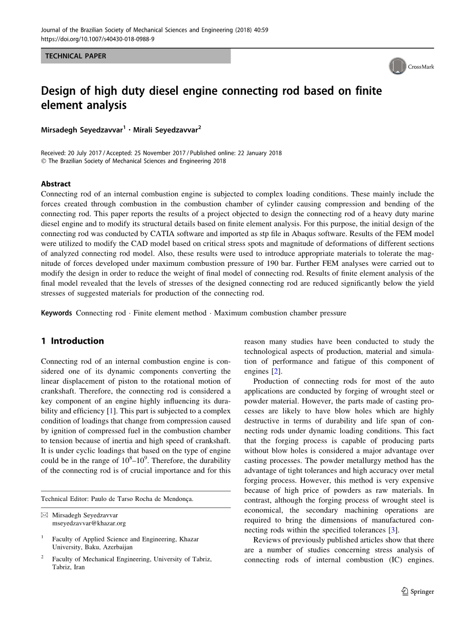 内燃机的连杆被认为是将活塞的线性位移转换成曲轴的旋转运动的动态部件之一。 因此,连杆被认为是高度影响发动机耐久性和效率的关键部件[1]。由于惯性和曲轴的高速度,连杆处于由燃烧室内压缩燃料着火引起的压力变化为负载的复杂状态。根据发动机类型可能存在范围为108-109的循环负载。因此,连杆的耐用性至关重要,为此,已经进行了许多有关这种发动机部件的生产,材料和性能以及疲劳的技术方面的研究[2]。