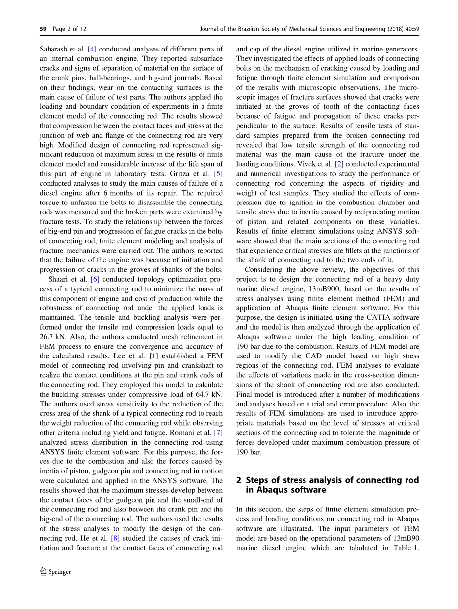 以前发表的文章评论显示,有许多关于内燃机连杆应力分析的研究。Saharash等人[4]对内燃机的不同部件进行了分析。他们报告了曲柄销,球轴承和大端轴颈表面上的表面裂纹和材料分离迹象。根据他们的发现,接触表面的磨损是测试部件失效的主要原因。作者在连杆的有限元模型中应用了实验的加载和边界条件。结果表明,接触面之间的压缩和连杆腹板与法兰连接处的应力非常高。连杆的改进设计代表了有限元模型结果中最大应力的显着减小以及在实验室测试中这部分发动机的使用寿命的显着增加。Gritza等人[5]进行了分析,以研究修理6个月后柴油机故障的主要原因。测量拆卸螺栓以拆卸连杆所需的扭矩,并通过断裂测试检查破损部分。为了研究连杆螺栓中大端销的受力与疲劳裂纹发展的关系,进行了有限元建模和断裂力学分析。作者报告说,发动机的故障是由于螺栓杆的槽中裂缝的萌生和进展。