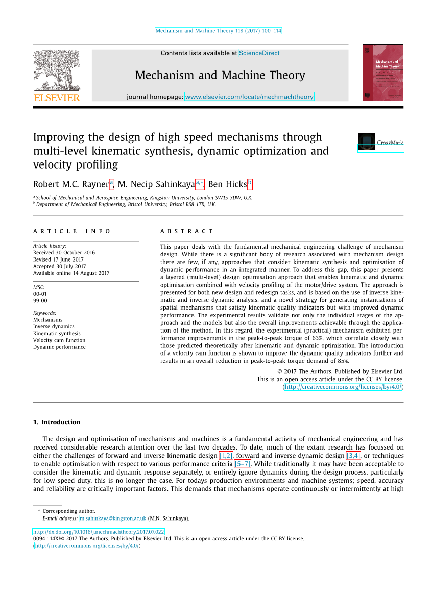 摘要 本文论述一个机械设计中的基本挑战。虽然有很多与机械设计相关的研究,但很少有以综合方式考虑运动合成和动态性能优化的方法。为了解决这个空缺,本文提出了一种分层多级优化方法,该方法能够结合电机驱动系统的速度曲线实现运动的动态优化。该方法基于反向动力学和逆动力学分析的使用,以及用于生成满足动力学质量指标而且具有动态性能的改进空间的机构的实例化的新策略。实验结果验证了方法与模型的各阶段的整体改进的可实现性。在这方面,试验机表现出63%的峰值转矩的性能改善,这与动态优化后的理论预测密切相关。速度凸轮的引入可进一步改善动态质量指标,且导致峰值扭矩需求总体减少85%。