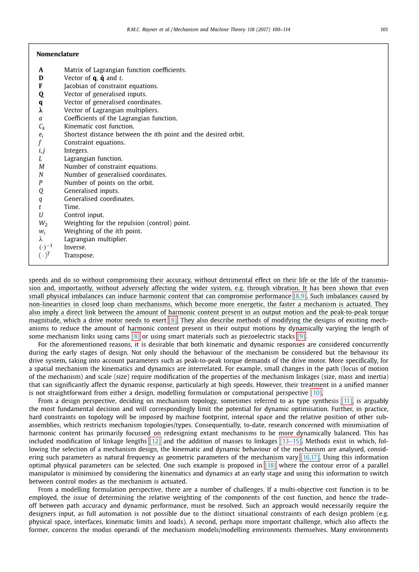 从建模公式的角度来看,存在许多挑战。如果要采用多目标成本函数,则必须确定成本函数的分量的相对加权以及因此路径精度和动态性能之间的折衷的问题。这种方法必然需要设计者输入,因为由于每个设计问题的不同情境限制(例如,物理空间,接口,运动限制和负载)。第二个也许是更重要的挑战,也影响前者,涉及机制模型/建模环境本身的运作方式。许多用于机构设计的环境允许连杆的尺寸(尺寸合成)连续建模,尽管在有界范围内[19]。这将经常导致不能执行连续循环运动但是具有抱死或限制配置的机构,通过这些配置它们不能以连续运动方式通过。在机构合体运作,可以检测极限配置的存在并相应地做出响应,例如,通过在成本函数中引入严重的惩罚,这将相应地严重影响目标函数和搜索策略[20],逆动力学建模器失效机制的含义是灾难性的。如果发生这种情况,则无法计算动态组件成本值,从而损害多目标成本函数的完整性[21]。这反过来又阻碍了应用定向搜索方法来优化系统的能力。