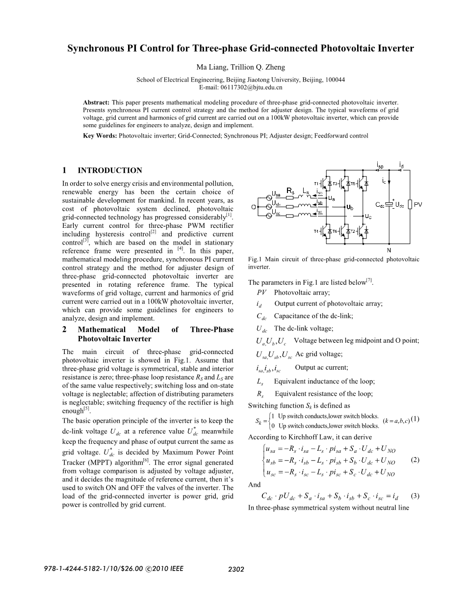 图1给出了三相并网光伏逆变器的主电路图。假设三相电网电压是对称的,稳定的和内部电阻为零;三相回路电阻RS和LS是相同的值;开关损耗和通态电压为零时;分布参数的影响是可以忽略的;整流器的开关频率足够高[ 5 ]。