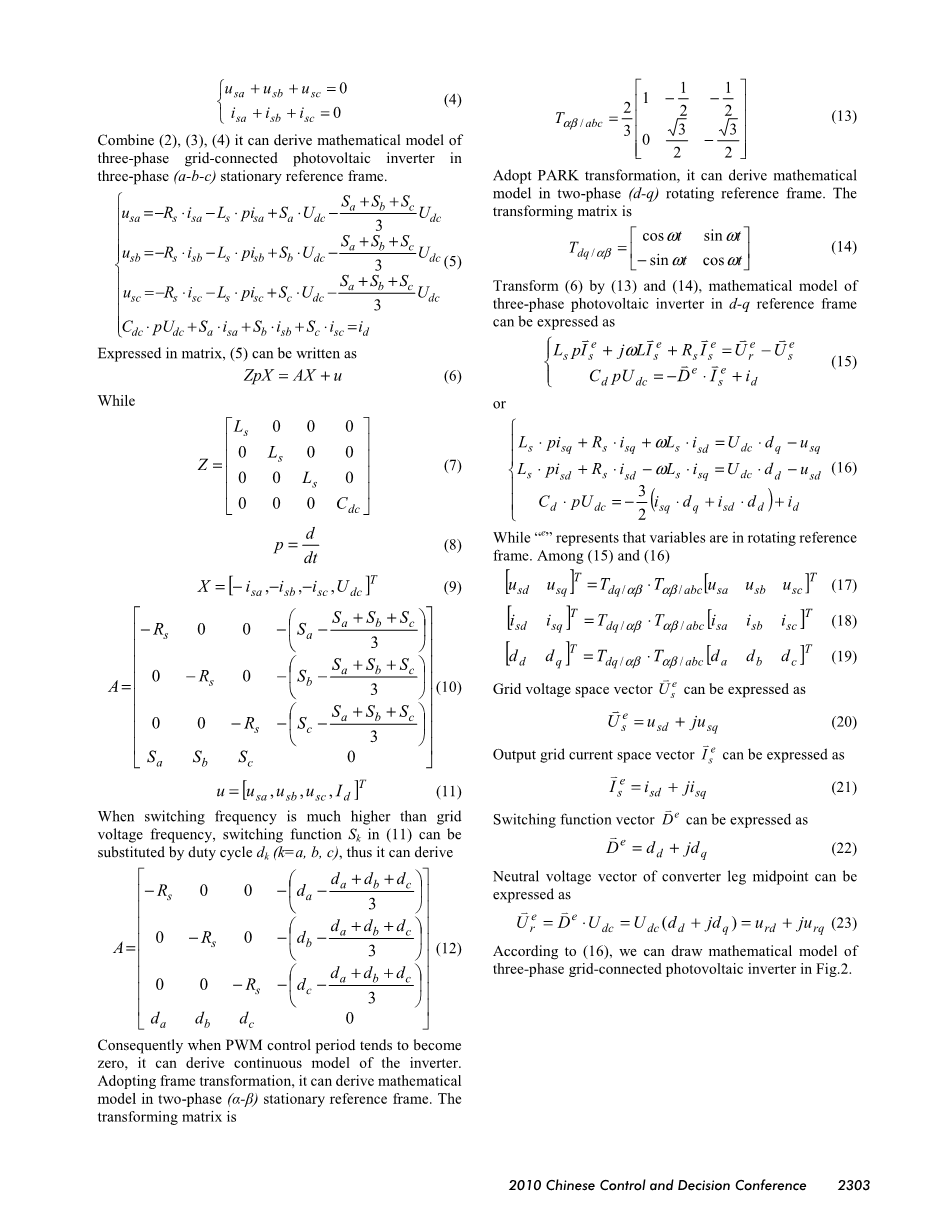 因此,当PWM控制周期逐渐变成零,它可以推导出逆变器的连续模型。采用坐标变换,可以导出数学模型(Į-两相静止坐标系ȕ)。 变换矩阵为