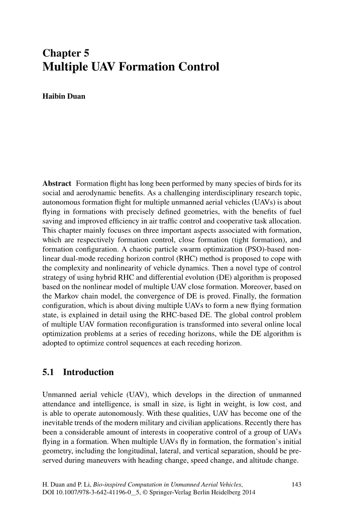 摘要:鸟群借助于空气动力实现的编队飞行对他们的社会和空气动力有益处,长期以来一直被许多鸟类所应用。作为一个具有挑战性的跨学科研究课题,多个无人飞行器(UAV)按照精确规定的几何形状进行自主编队飞行,在空中交通管制和协同任务分配中实现节省燃油与提高效率的效益要求。本章主要关注编队的三个重要方面,分别是编队控制,紧随编队(紧密编队),和编队构形。基于非线性的双模滚动时域控制(RHC)提出了一种混沌粒子群优化算法,用于处理机械动力学的复杂性与非线性。基于非线性模型的多无人机紧密编队算法,提出了利用混合RHC和差分进化(DE)算法是一种新型的控制策略。此外,基于马尔可夫链模型,证明了DE的收敛性。最后,使用基于RHC的DE算法,详细说明了一个新的潜行多无人机编队飞行状态形成的编队。多无人机编队重构全的局控制问题转化为在一系列移动时域内的几个在线的局部优化问题, DE算法用来优化在每个移动时域控制的序列。