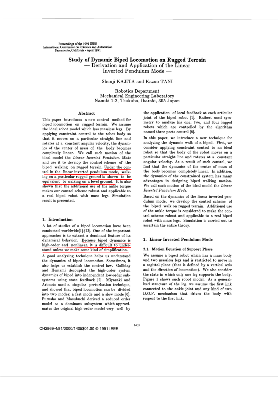 [1] Furusho, J.,and Masubuchi, M., 'A Theoretically Motivated Reduced Order Model for the Control of Dynamic Biped Locomotion,' ASME Journal of Dynamic Systems, Measurement, and Control,Vo1.109, 1987, pp.155-163