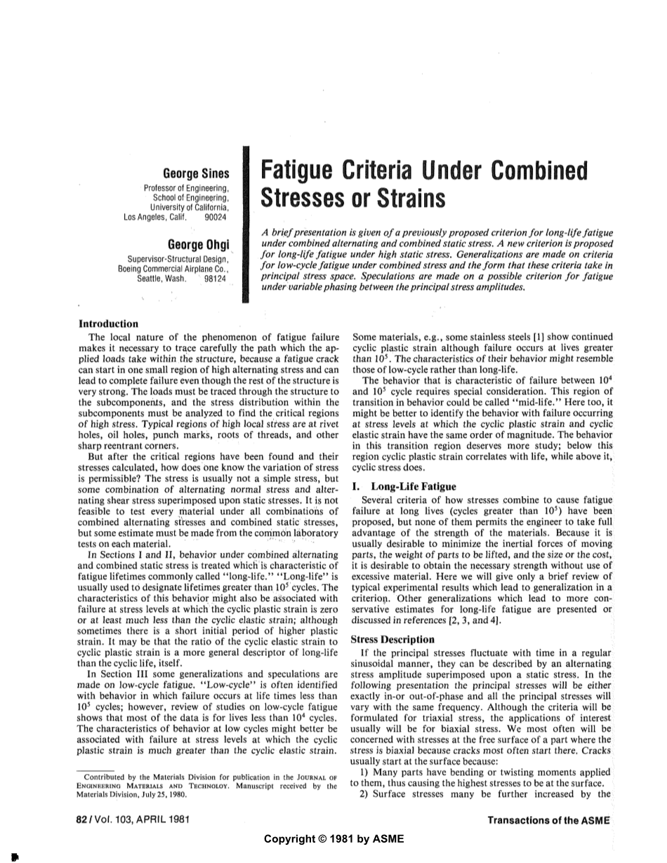 但问题是,在找到关键区域并计算其应力之后,人们如何知道应力的变化是可靠的? 这种应力通常不是简单的静态应力,而是交替法向应力和交替剪切应力的某种组合叠加在静态应力上。测试每种材料在组合交变应力和组合静应力的所有组合显然是不现实的,但我们必须从每种材料的常见实验室测试中做出一些估计。在本文第I部分和第II部分中,分析处理了结构在交替和组合静态应力下的疲劳性质,这是疲劳寿命的特征,通常称为“高周期”。“高周期”通常用于指定大于次周期的寿命。这种疲劳特征也可能与循环塑性应变为零或至少远小于循环弹性应变的应力水平下的失效有关。虽然有时塑性应变的初始阶段较短。但可能的是,循环弹性应变与循环塑性应变的比率是高周期的更一般性的描述,而不是循环周期本身。