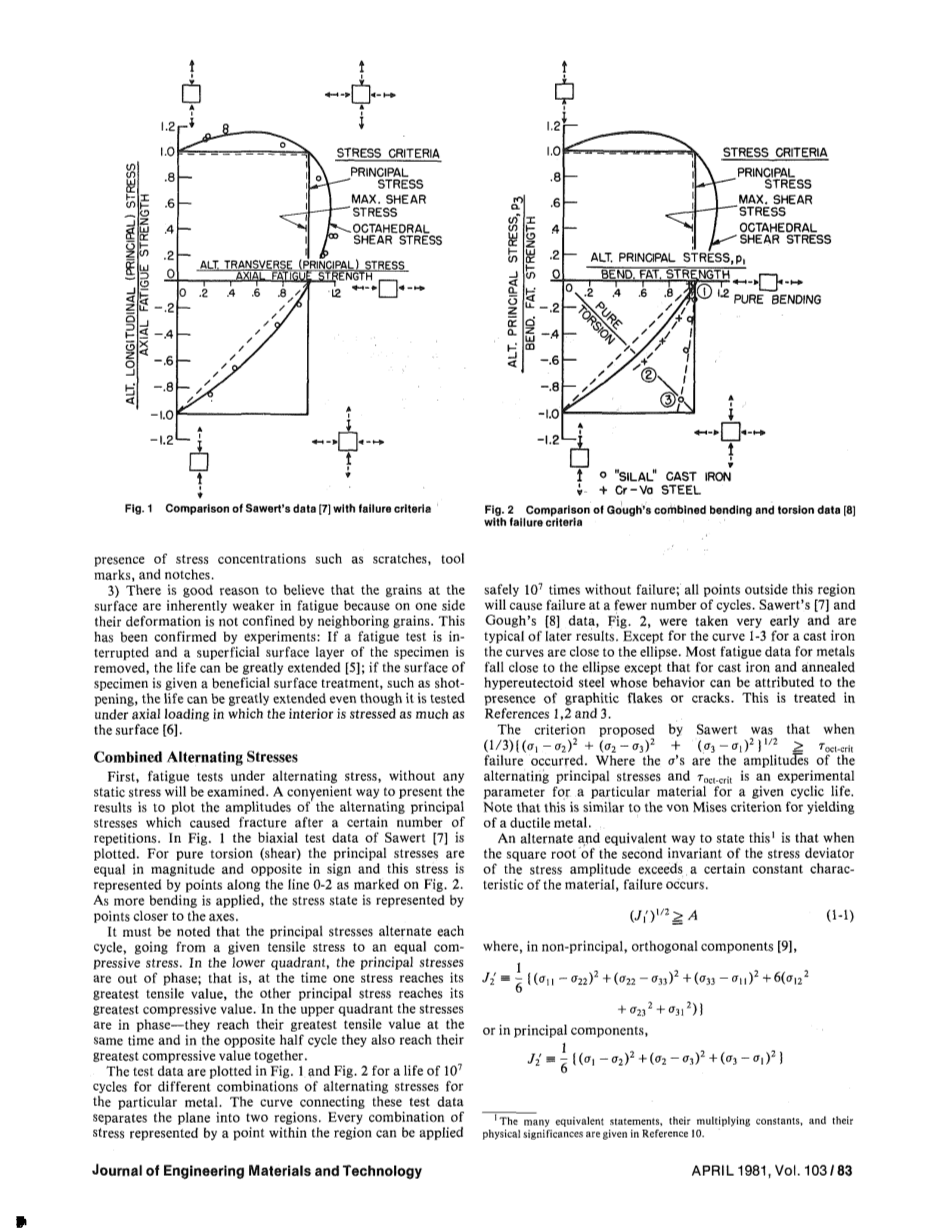 Sawert提出的标准是当这个公式出现问题时,其中是交替主应力的振幅,是给定循环寿命的特定材料的实验参数。注意,这类似于屈服金属屈服的von Mises标准。另一种说明这种情况的方法是,当应力幅度的应力偏差的第二个不变量的平方根超过材料的某个常数特征时,就会发生故障。