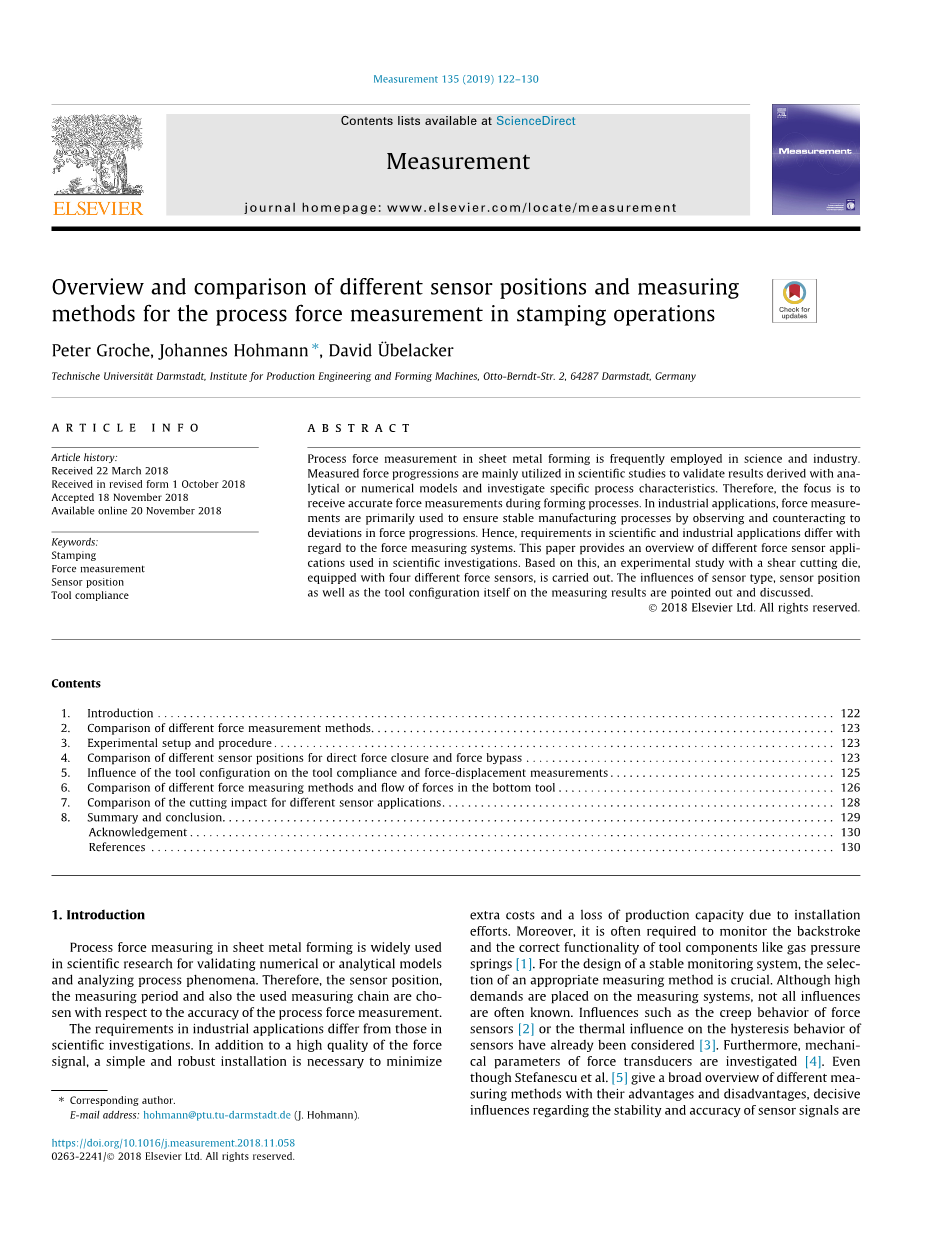 金属板材成形过程中的过程力测量在科学和工业中得到了广泛的应用。测量力的进展主要用于科学研究,以分析或数值模型验证所得到的结果,并研究具体的过程特性。因此,重点是在成形过程中接受准确的力测量。在工业应用中,力测量主要是通过观察和抵消力的偏差来确保稳定的制造过程。因此,科学和工业应用对力测量系统的要求各不相同。本文概述了不同的力传感器在科学研究中的应用。在此基础上,进行了剪切模的实验研究,并配备了四个不同的力传感器。指出并讨论了传感器类型、传感器位置以及刀具配置对测量结果的影响。