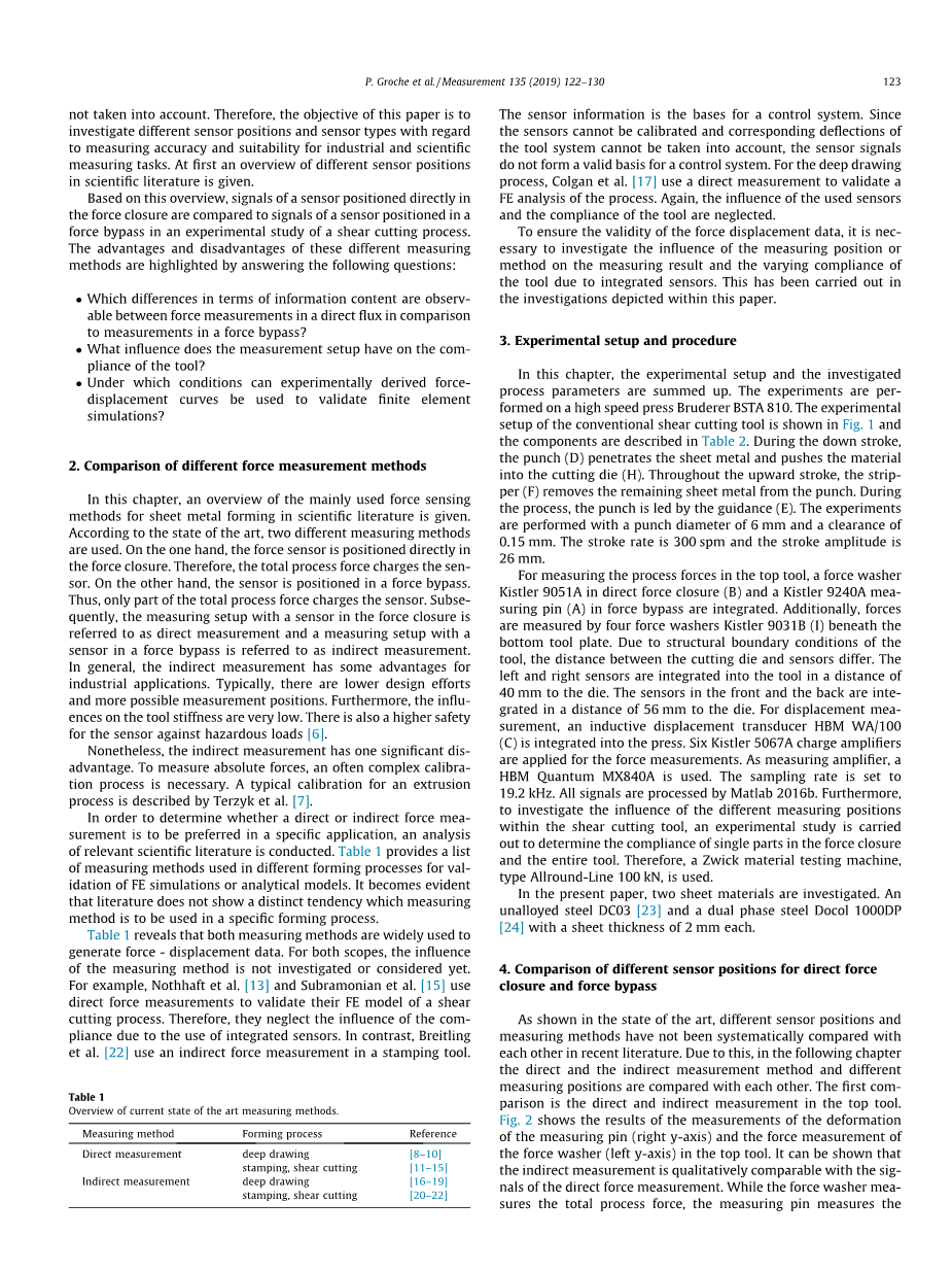 两种测量方法都被广泛用于生成力位移数据。对于这两个范围,测量方法的影响尚未被调查或考虑。例如,Nothhaft等人[13]和斯巴莫尼安等人使用直接的力测量来验证他们的剪切过程的fe模型。 因此,由于使用了综合传感器,它们忽视了合规的影响。与此相反,Breitling等人在冲压工具中使用了间接力测量。传感器信息是控制系统的基础。由于传感器无法校准,也无法考虑刀具系统的相应偏转,因此传感器信号不能构成控制系统的有效基础。对于深绘过程,Colgan等人[17]使用直接测量来验证该过程的fe分析。同样,所用传感器的影响和工具的符合性也被忽略了。