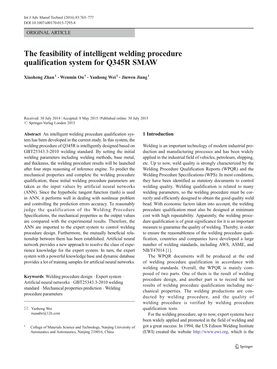 关键词:焊接工艺设计、专家系统、人工神经网络、GBT25343 3-2010焊接标准、机械性能预测、焊接