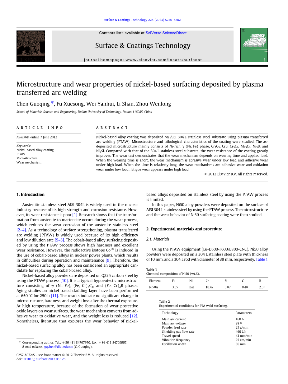 由于其高强度和耐腐蚀性能,不锈钢AISI 304L被广泛用于核工业。然而,它的耐磨性很差[1]。研究表明,在磨损过程中,从奥氏体到马氏体的转变,减少了奥氏体不锈钢的磨损【2-4】。作为一种表面强化技术,等离子体转移弧焊(PTAW)由于其高效、低稀释率而得到广泛应用【5-8】。采用PTAW工艺熔覆的钴基合金表面硬度高,耐磨性好。然而,放射性同位素Co60是在核电站使用钴合金的过程中产生的,这导致了操作和维护方面的困难【9】。因此,镍基合金表面合金被认为是代替钴基合金较为合适的候选者。